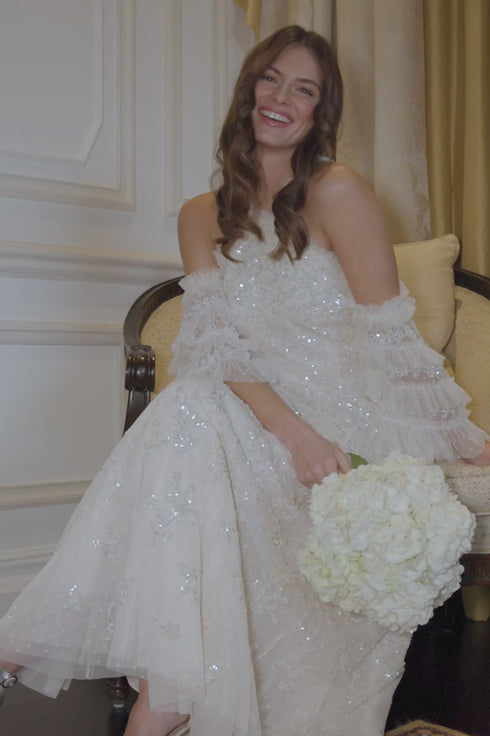 The Floral Lace Off-Shoulder Ankle Gown in Cream. This beautiful dress is embellished with tiny sequins in an overlapping linear formation depicting an exquisite floral design inspired by vintage lace from the early 1900s. The statement off-the-shoulder design has a flattering curved neckline and straps, adorned with signature Needle & Thread soft tulle ruffles. The fluted sleeves are decorated in frothy tulle ruffles and adorned with glittering sequins in floral motifs. The skirt is made up of generous layers of net and tulle with sweeping hemline. The perfect statement style for a special occasion.