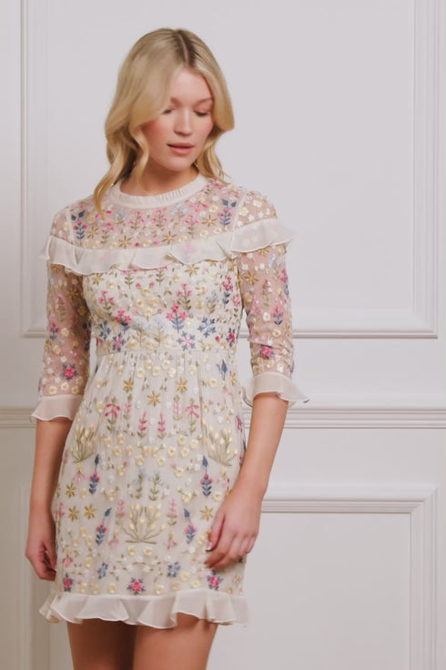 The Flowerbed Embroidery Mini Dress in Cream is a pretty, heritage Needle & Thread design. It showcases multi-coloured floral embroidery, with shimmering sequins scattered towards the hem for a captivating effect. Crafted from soft chiffon, delicate frills adorn the yoke, cuffs, and skirt, enhancing its romantic charm. The gathered skirt creates a flattering, graceful silhouette. A timeless and elegant dress, perfect for any occasion.