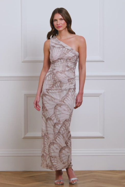 The Flutter Draped One-Shoulder Ankle Gown in Chestnut features a hand-painted watercolour butterfly print, with soft motifs that vary in scale. The elegant one-shoulder design is enhanced by soft ruching, creating a flattering silhouette. Crafted from stretch power mesh, this gown offers both comfort and ease. The perfect choice for an upcoming holiday.