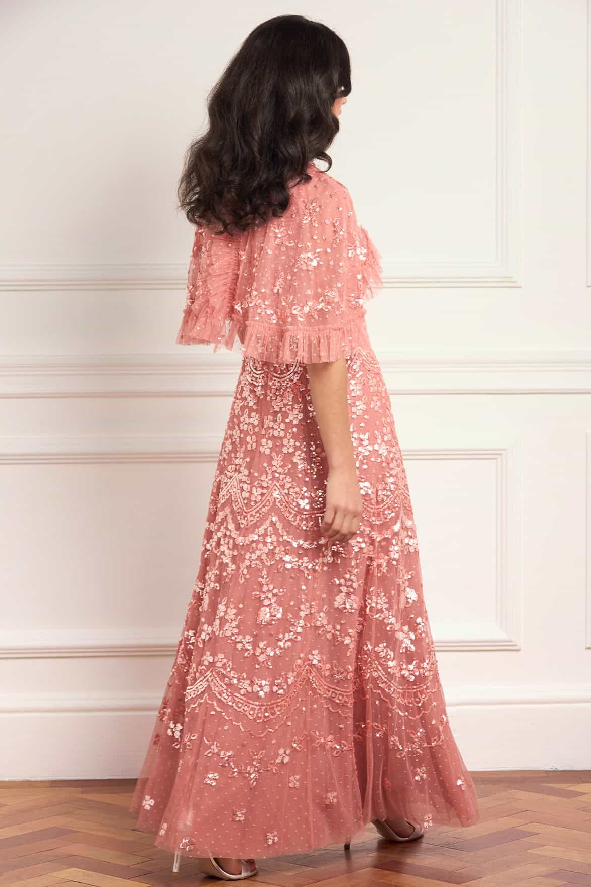NEW SEASON. The Freya Cape Ankle Gown in Misty Rose. Exquisite Freya embellishment inspired by antique lacework adorns this romantic cape gown. Tiny high-gloss sequins and intricate scalloped borders create a flattering silhouette that softly fades towards the hem. The flowing ankle-length shape offers graceful movement for luxury evening wear.