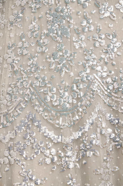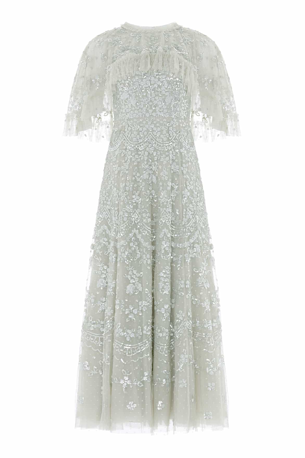 NEW SEASON. The Freya Cape Ankle Gown in Seafoam. Adorned with exquisite Freya embellishment inspired by antique lacework, this ankle gown features intricate floral borders and softly scalloped detailing. Designed with flowing cape sleeves and a flattering silhouette, the high-gloss sequins gradually fade toward the hem for romantic movement.