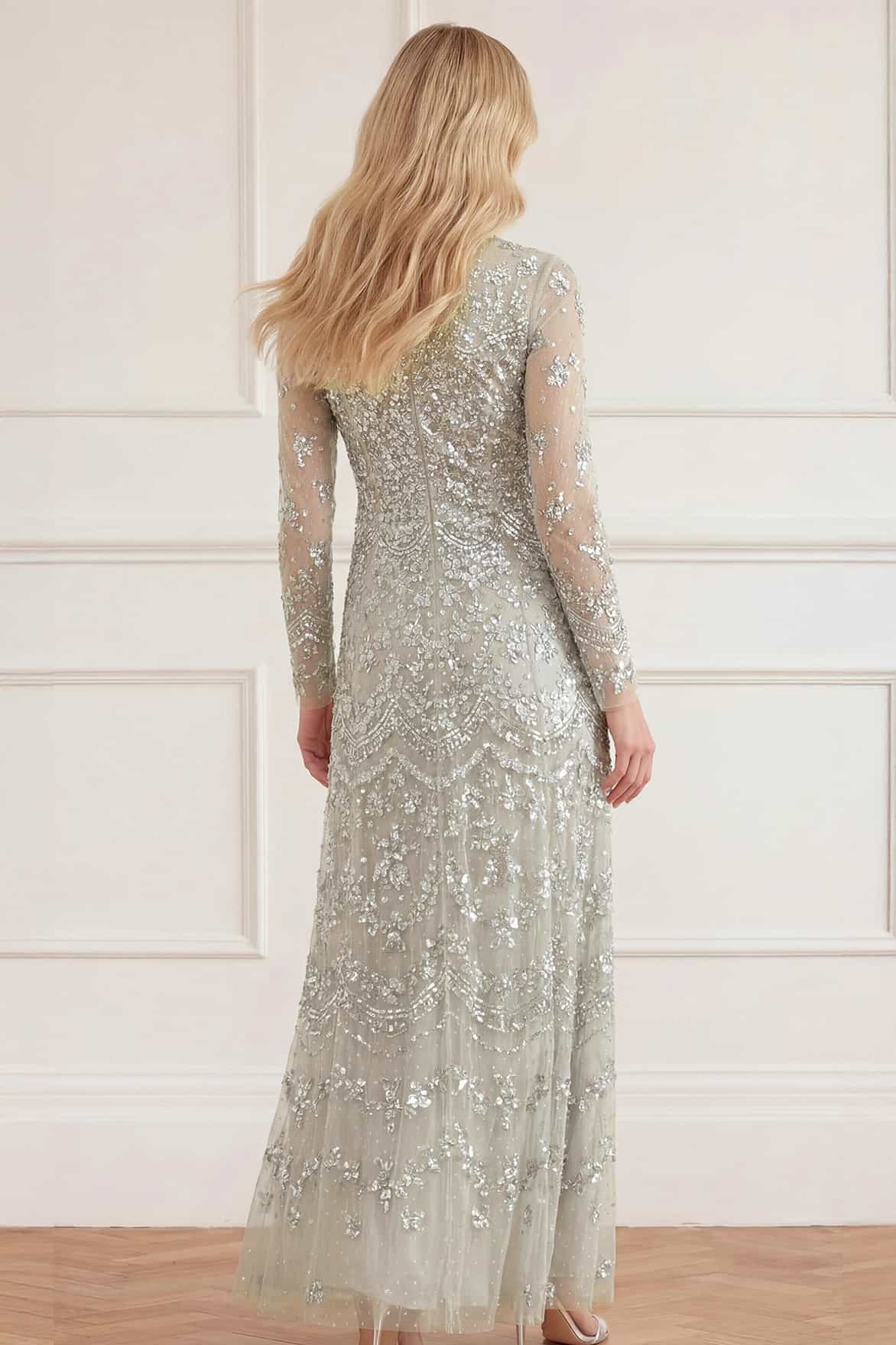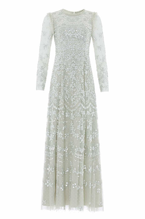 NEW SEASON. The Freya Long Sleeve Gown in Seafoam. Featuring intricate sequin embellishment with graceful scalloped borders, this long sleeve gown captures the glow of late summer evenings. The fitted bodice and flowing full-length skirt create a flattering, feminine shape. A timeless piece for luxury evening wear.