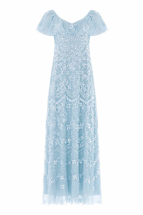 NEW SEASON. The Freya V-Neck Gown in Aqua. A romantic full-length gown adorned with intricate Freya sequin embroidery inspired by antique lace. The flattering V-neckline elongates the silhouette, while scalloped borders softly fade towards the hem for graceful movement.
