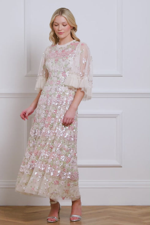 The Garden Delight Gloss Ankle Gown in Cream features intricate embroidery inspired by a lace tablecloth, with bold floral lace border details. Featuring specially finished sequins, coated for an ultra-high shine, enhance the gown's sun-kissed peachy pink tones, evoking a summer garden. Developed with voluminous sleeves, gathered frills at the hem, and a generous cut add to its romantic charm. Make a lasting impression in the Garden Delight.