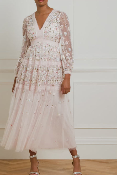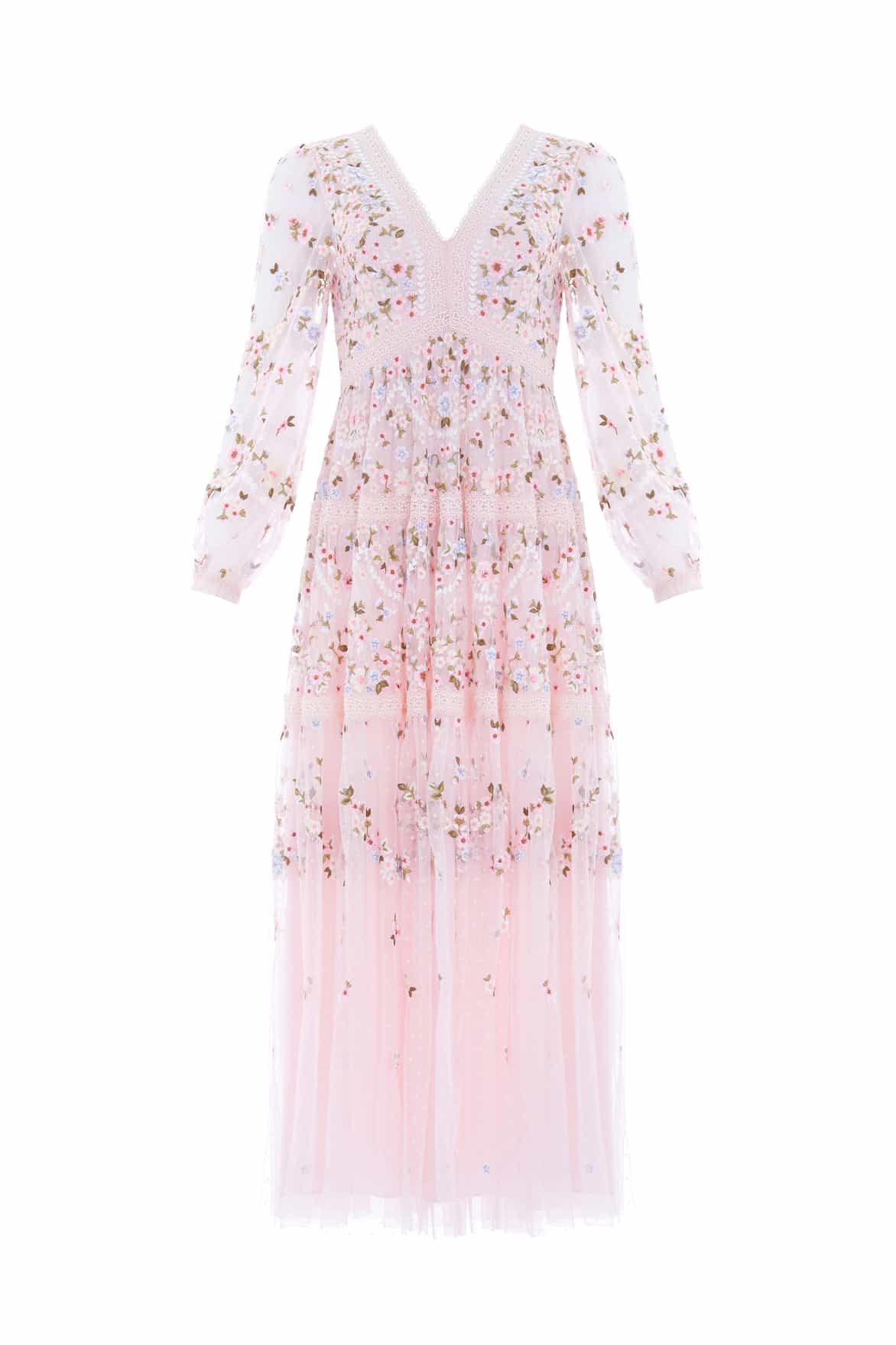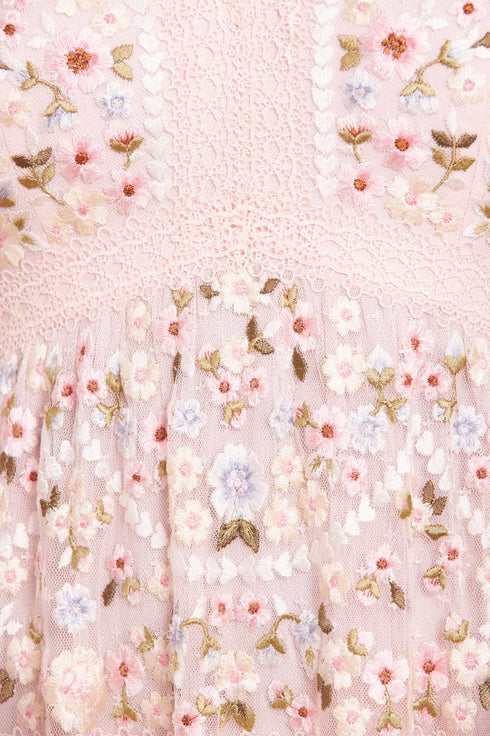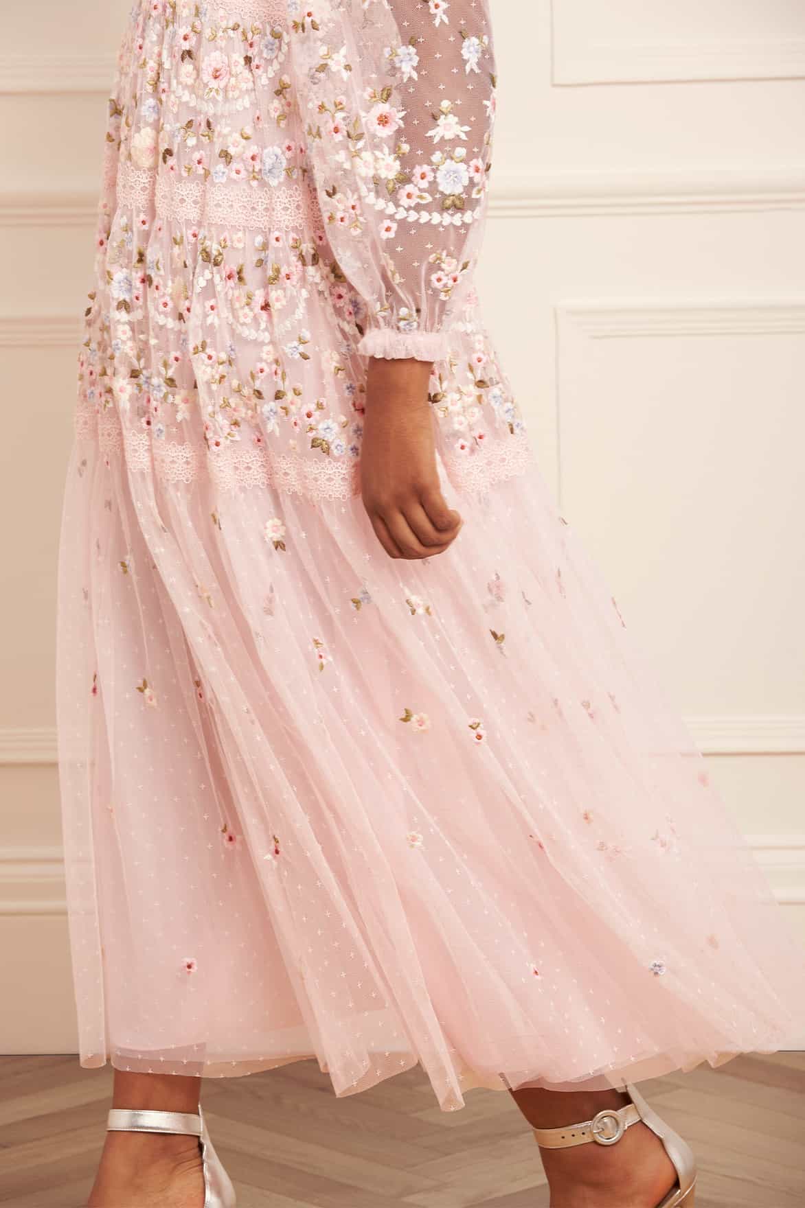 The Garland Ribbon Ankle Gown in Peony Pink. This embroidered gown is inspired by Victorian lace trims. Beautifully designed with floral embroidery in soft pastel tones. Developed with a V-shaped waist seam to create a flattering, effortless fit. This gown is adorned with intricate lace trims for signature Needle & Thread detailing. A pretty piece you'll forever treasure.