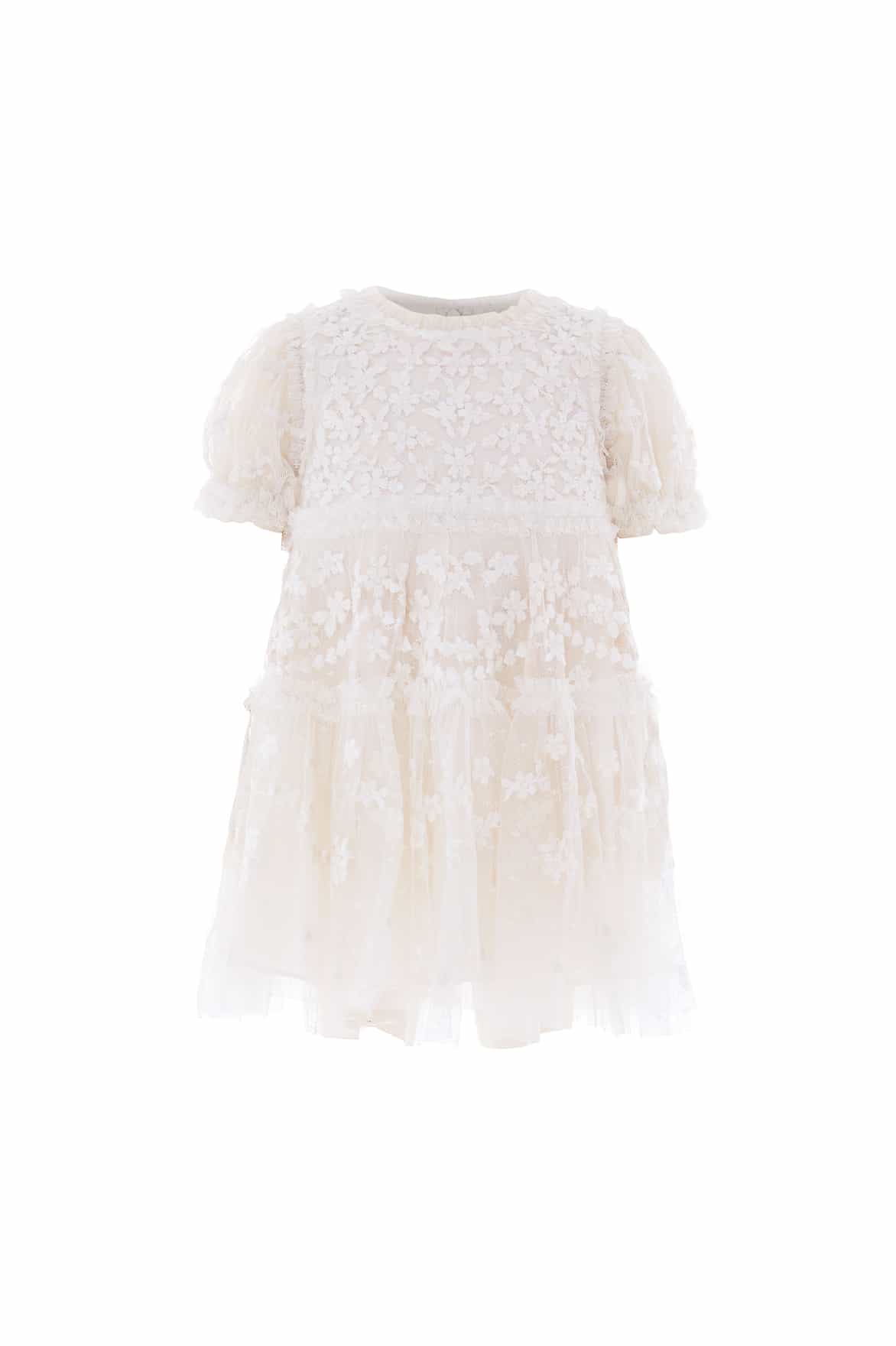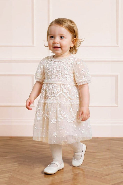 The Garland Ribbon Baby Dress in Cream. This charming dress features Victorian lace-inspired embroidery with pastel floral motifs. Delicate ruffled puff sleeves and frills at the neckline and shoulders add a sweet touch. The gathered skirt hem is finished with a playful frill for added volume. Lined in soft cotton voile for comfort, the set includes matching cotton dobby bloomers with frilled edges. The perfect dress for your little one’s upcoming special occasion.
