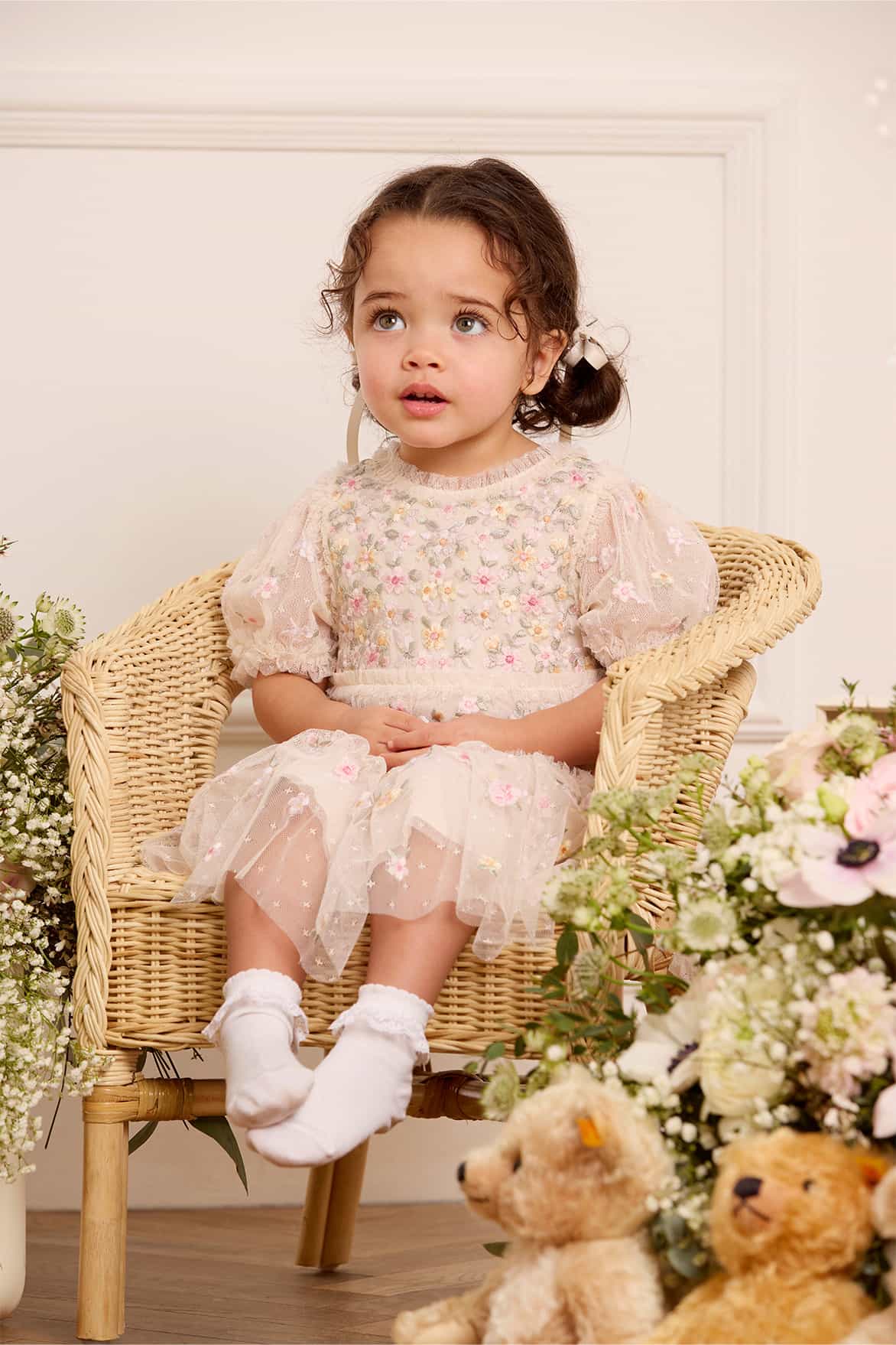NEW SEASON. The Garland Ribbon Baby Dress in Cream/Multi. This charming dress features Victorian lace-inspired embroidery with pastel floral motifs and white highlights. Delicate ruffled puff sleeves and frills at the neckline and shoulders add a sweet touch. The gathered skirt hem is finished with a playful frill for added volume. Lined in soft cotton voile for comfort, the set includes matching cotton dobby bloomers with frilled edges. The perfect dress for your little one’s upcoming special occasion.