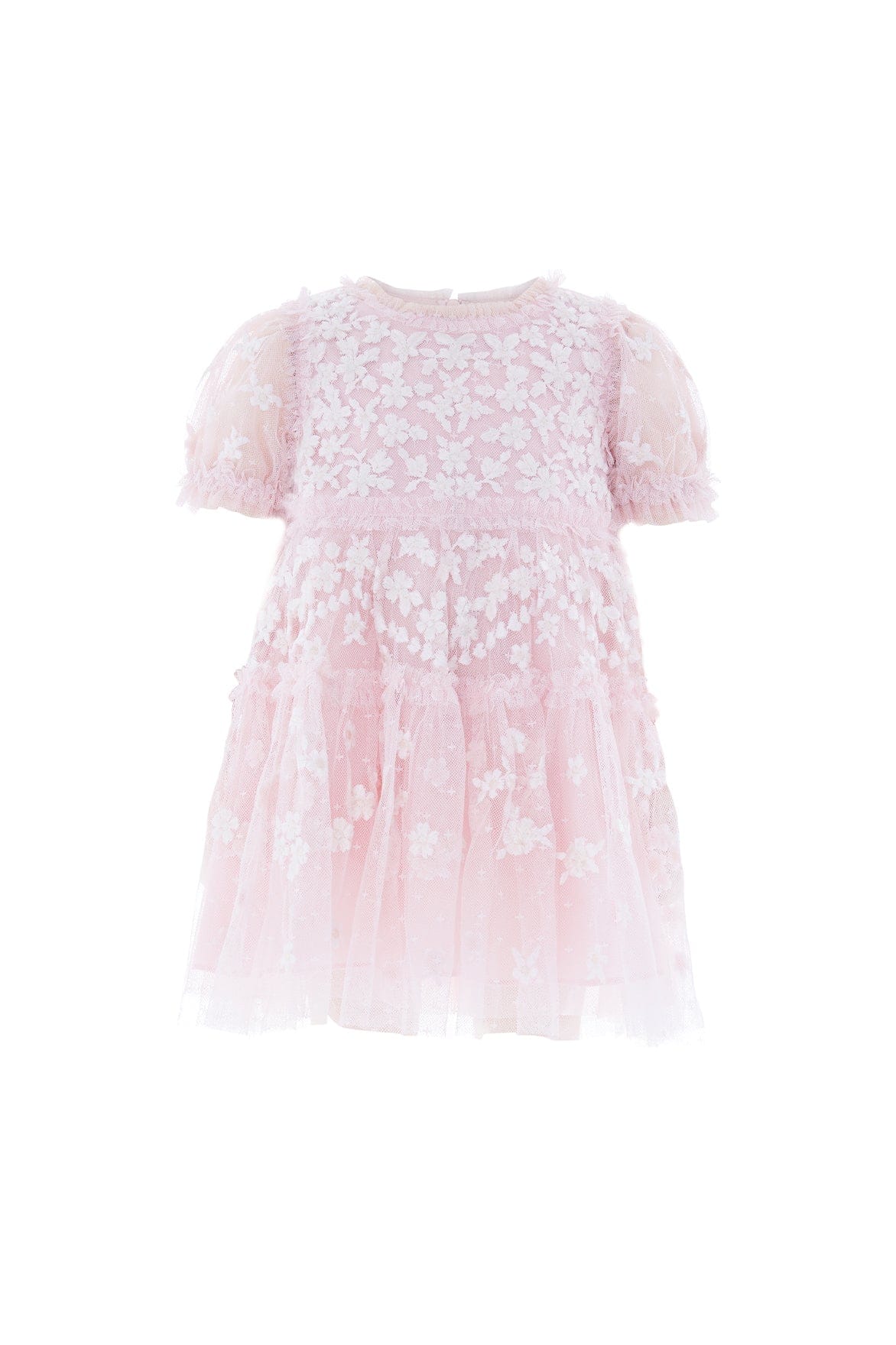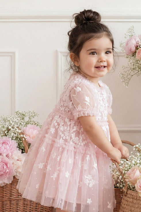 The Garland Ribbon Baby Dress in Peony Pink/Cream. Beautifully decorated with delicate floral embroidery and ribbon detailing. Crafted with soft layers, the design creates a gentle silhouette with subtle volume and movement.