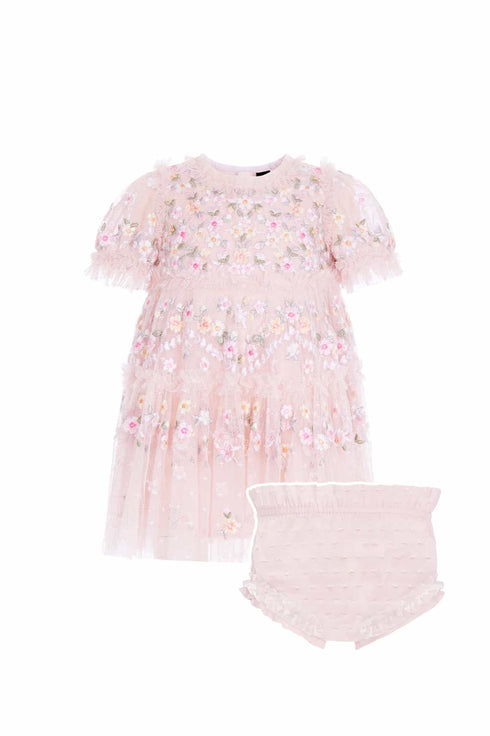 NEW SEASON. The Garland Ribbon Baby Dress in Peony Pink/Multi. This charming dress features Victorian lace-inspired embroidery with pastel floral motifs and white highlights. Delicate ruffled puff sleeves and frills at the neckline and shoulders add a sweet touch. The gathered skirt hem is finished with a playful frill for added volume. Lined in soft cotton voile for comfort, the set includes matching cotton dobby bloomers with frilled edges. The perfect dress for your little one’s upcoming special occasion.