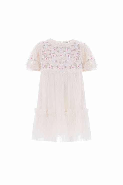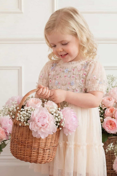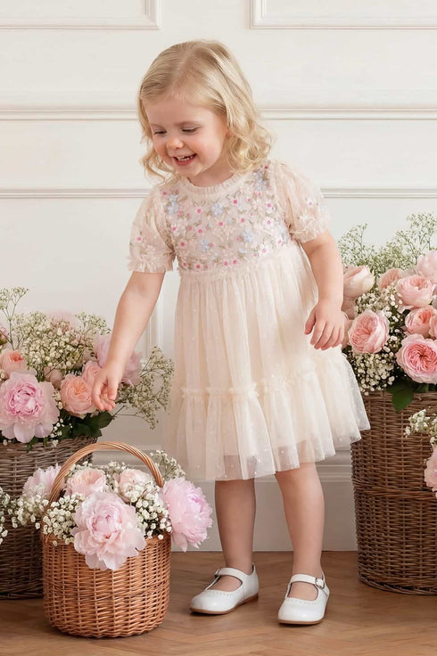 NEW SEASON. The Garland Ribbon Bodice Baby Dress in Cream/Pastel. Features delicate ribbon embroidery and soft tulle layers. With a lightly gathered waist and flutter sleeves, it’s a charming design made for little celebrations. This design pairs beautifully with the Garland Ribbon Ankle Gown from the womenswear line for a harmonious moment.