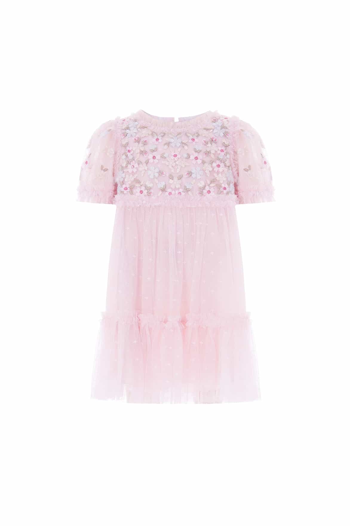 NEW SEASON. The Garland Ribbon Bodice Baby Dress in Peony Pink/Pastel. Crafted with intricate ribbon embroidery in soft pastel tones. With airy tulle layers and gentle volume, it captures Needle & Thread’s signature romantic detailing. This piece mirrors the Garland Ribbon Gown from the womenswear line for a beautifully unified look.