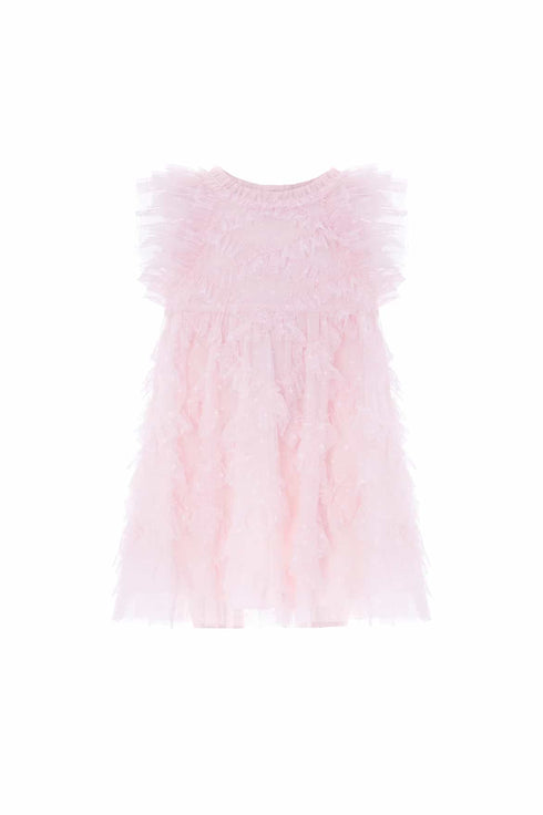 NEW SEASON. The Genevieve Baby Dress in Peony Pink. Features layers of soft tulle decorated with dainty floral embroidery. With a gathered skirt and subtle frills, it’s a sweet and elegant design for special moments.