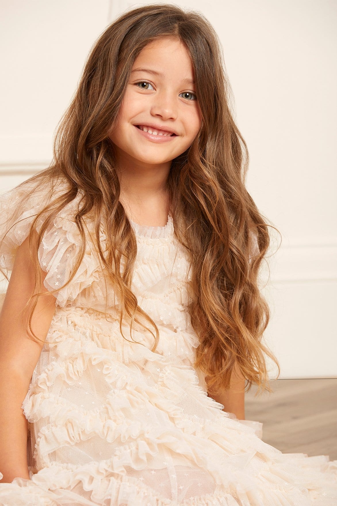 NEW SEASON | NEEDLE & THREAD EXCLUSIVE. The Genevieve KIDS Dress in Champagne. This frothy textured dress is designed with playfully dramatic sleeves to create frilly fullness at the shoulders. It also features diamond stitch detailing resulting in a beautifully textile finish. Let your little one take centre stage in this statement piece.