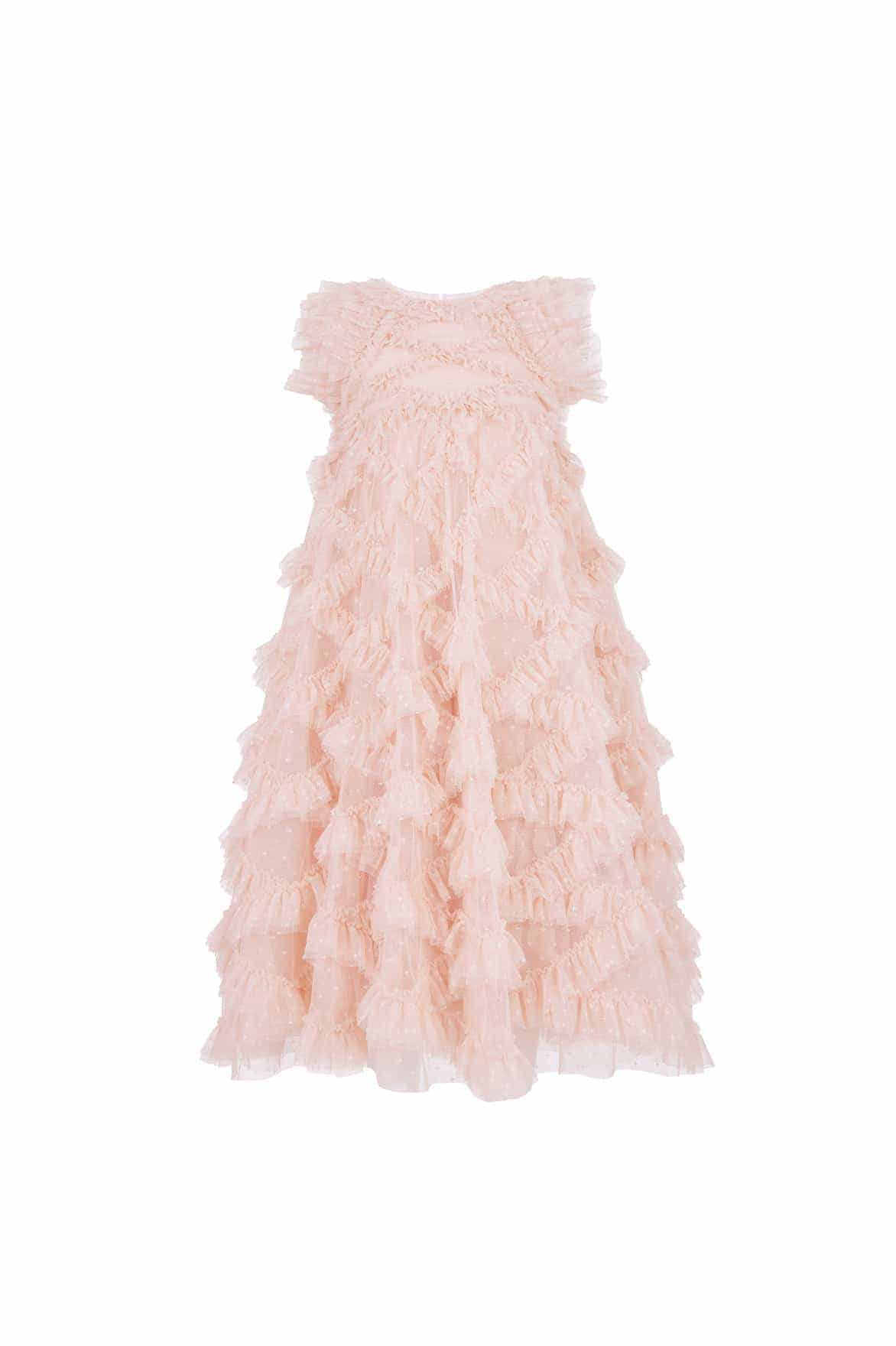 NEW SEASON. The Genevieve Kids Gown in Opal. A graceful full-length kids gown featuring romantic ruffle detailing inspired by drifting summer petals. The flowing skirt creates a magical silhouette for little ones. An enchanting flower girl style, designed to complement the Genevieve Gown.