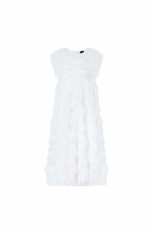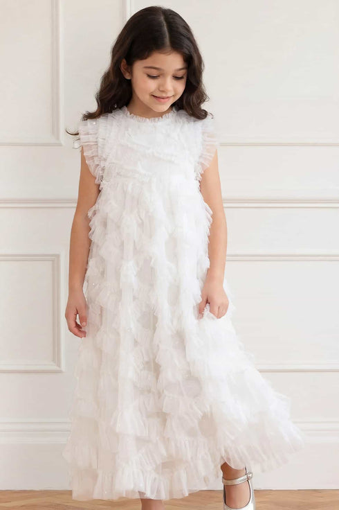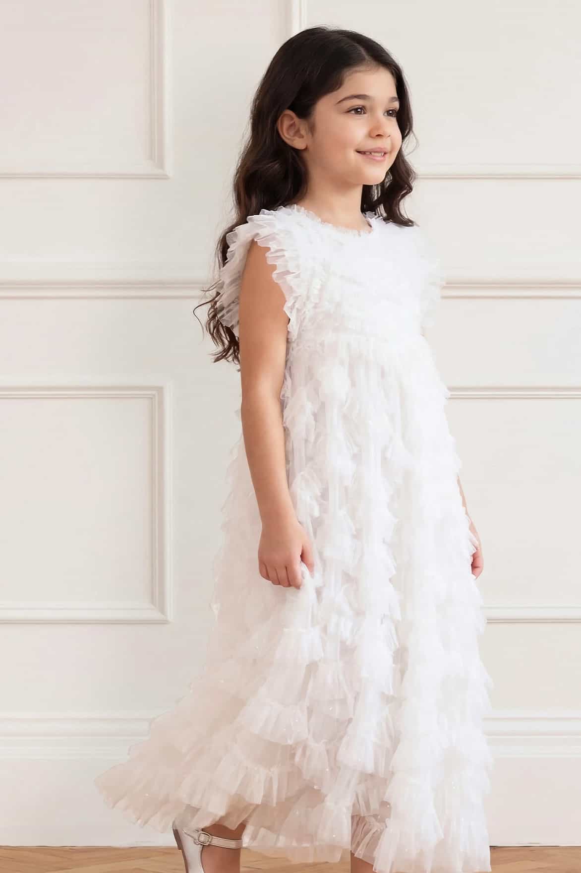 NEW SEASON. The Genevieve Kids Gown in Swan White. This ethereal full-length gown is designed with cascading ruffle accents that enhance its softly structured shape. The flowing skirt moves beautifully with every step. A timeless occasion piece, thoughtfully reflecting the Genevieve Gown.