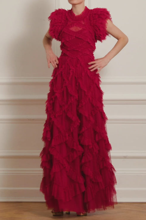 The Genevieve Rose Gown in Red. This statement gown is inspired by 1930s Hollywood glamour. Beautifully designed with diamond tulle details and trims. Crafted with multiple layers of ruffled, frothy tulle sculpted for dramatic effect. Make the ultimate style statement this season.