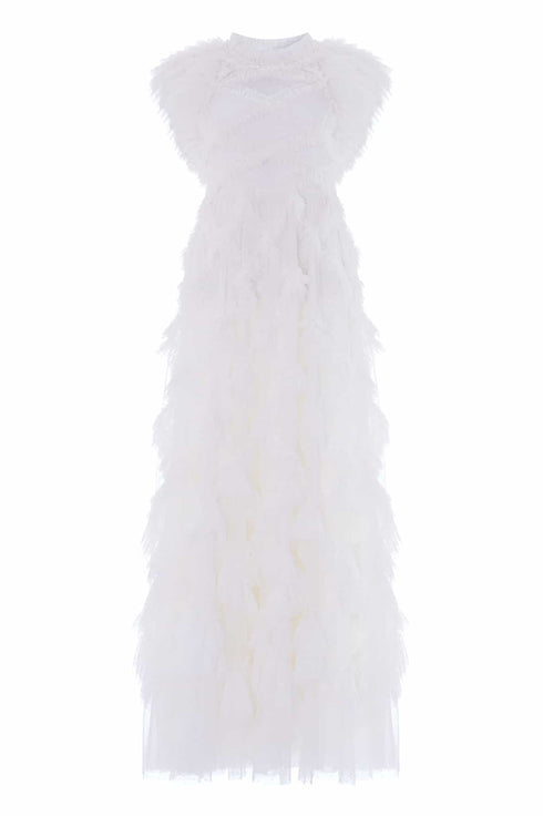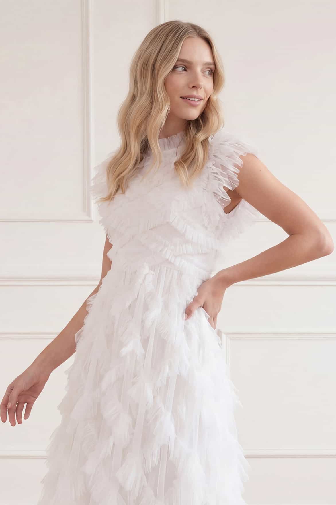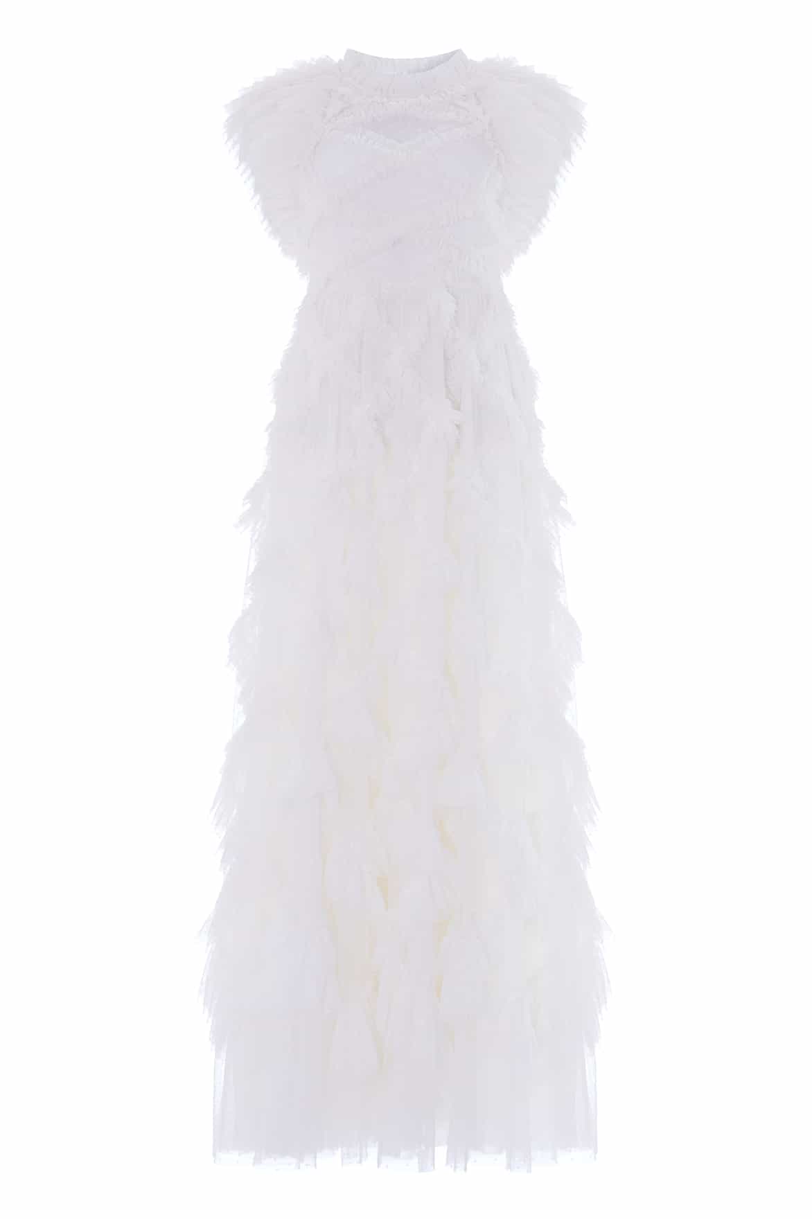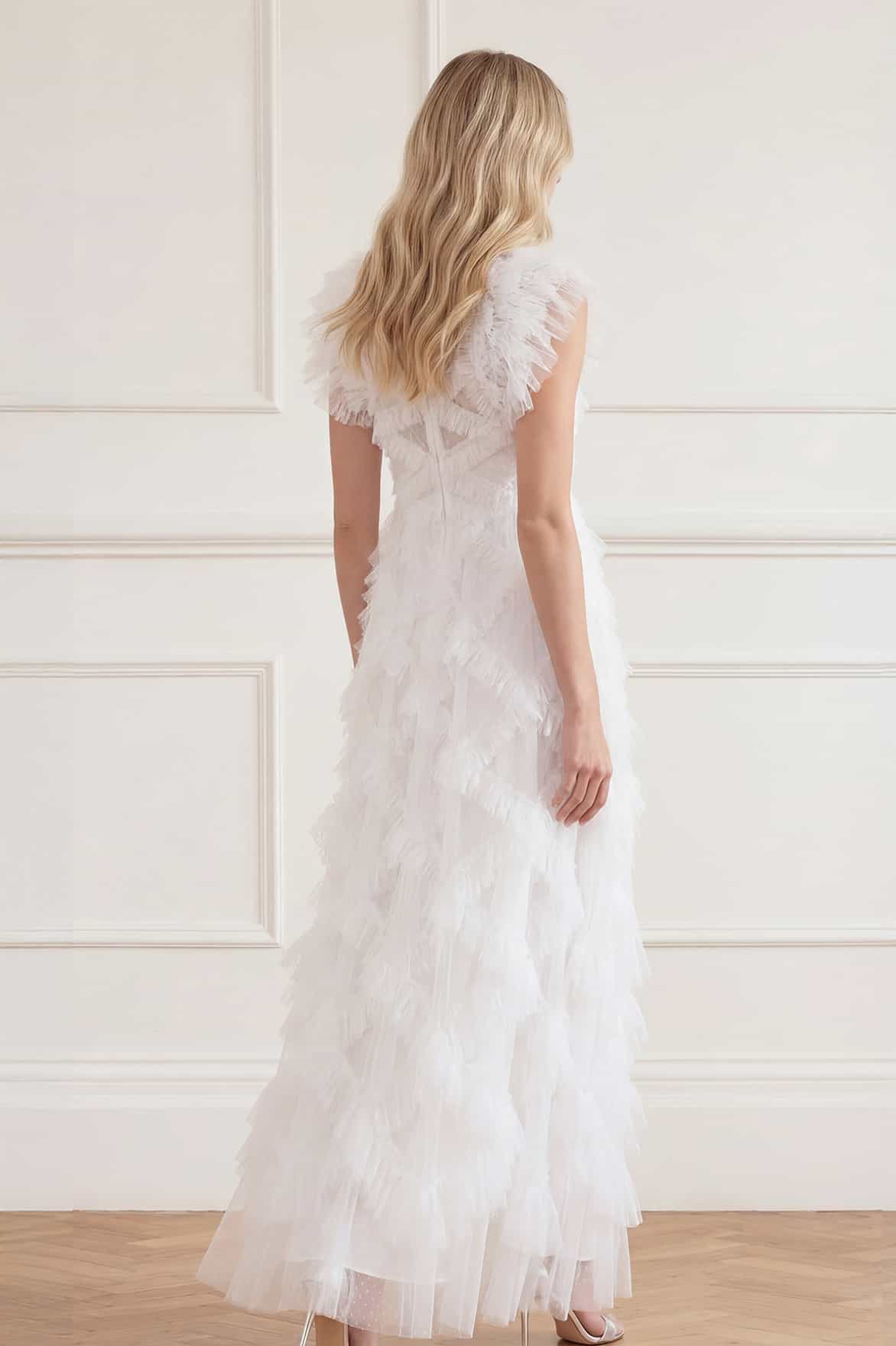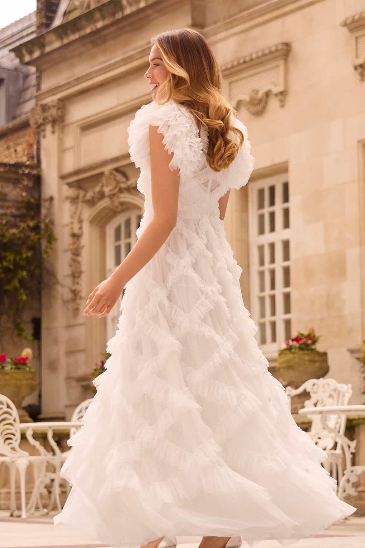 NEW SEASON. The Genevieve Ruffle Gown in Swan White. This dramatic ruffle gown captures the movement of petals drifting through warm summer air. Designed with cascading ruffle detailing across a softly sculpted bodice, the full-length skirt flows beautifully with every step.