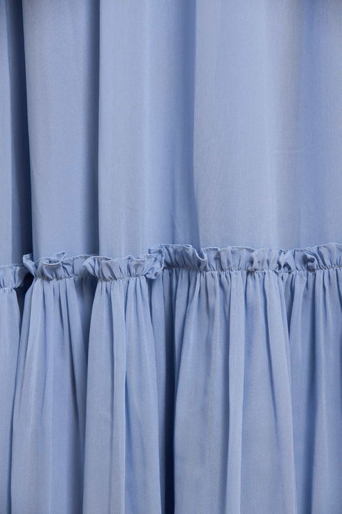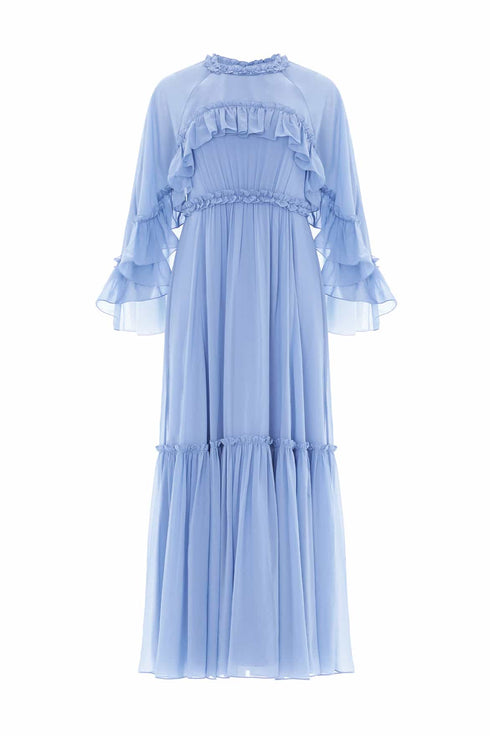 The Harper Chiffon Cape Ankle Gown in Sky Blue is a striking yet elegant design featuring a dramatic cape with a detachable fastening for versatile styling. Crafted from the softest chiffon, it offers a romantic, flowing silhouette. A perfect gown to transition seamlessly from day to night.