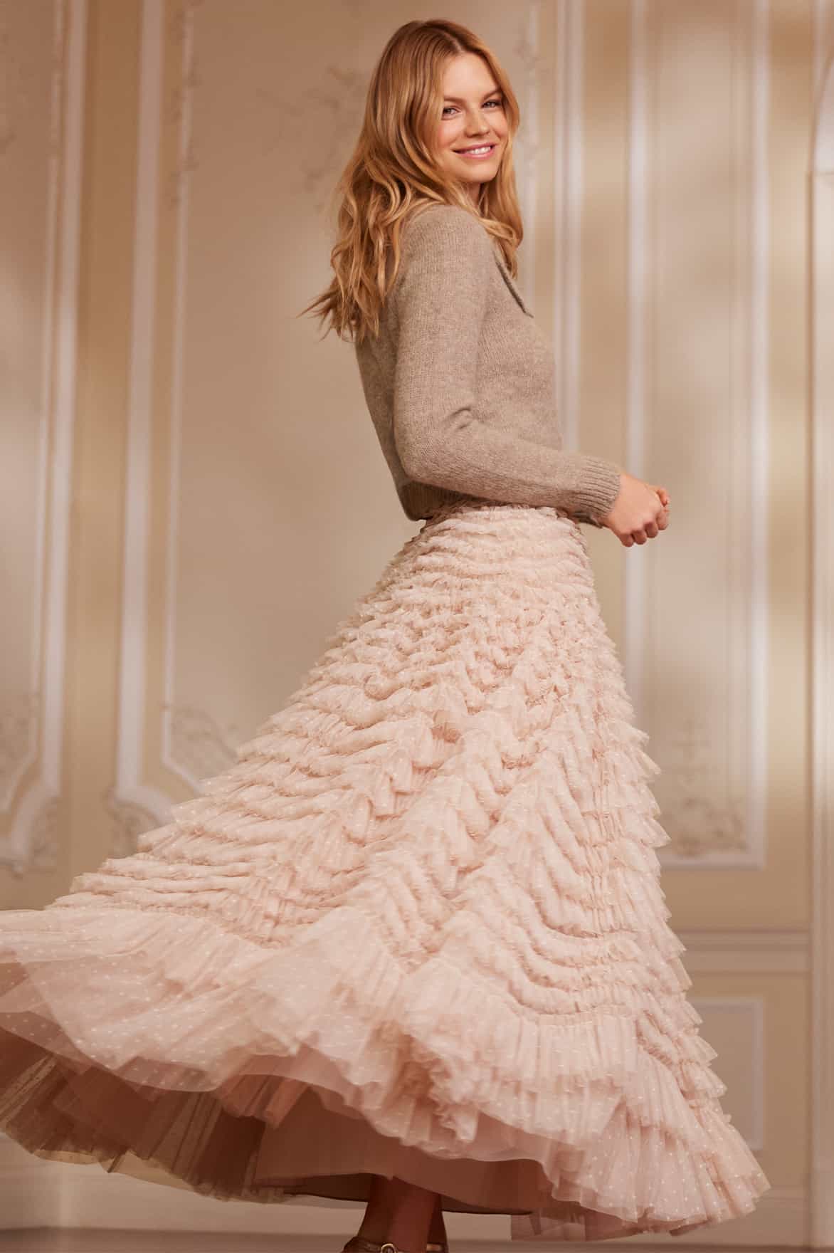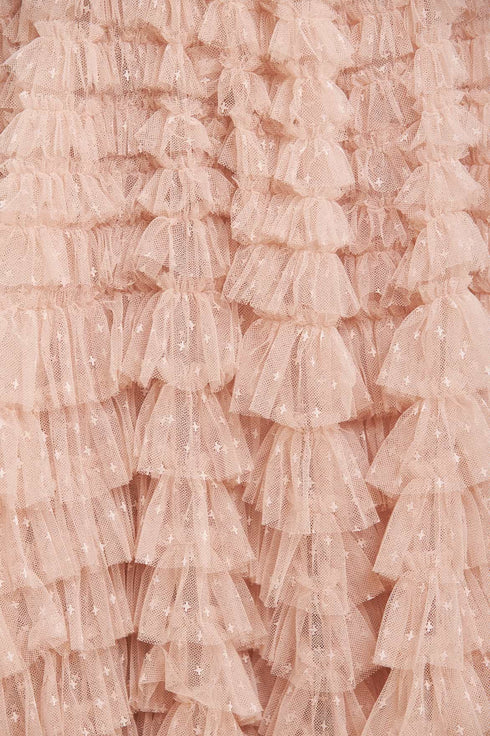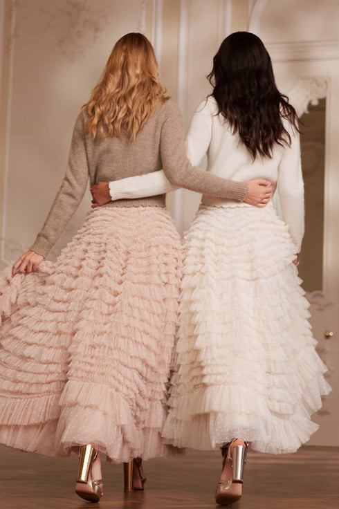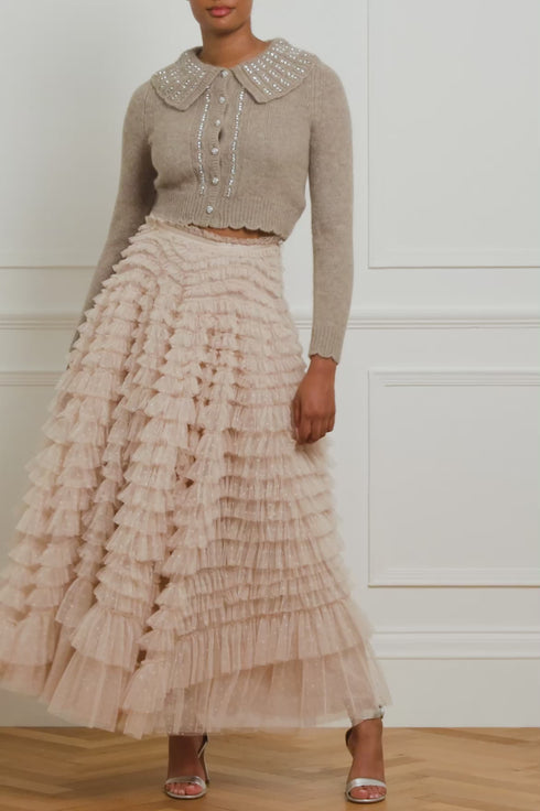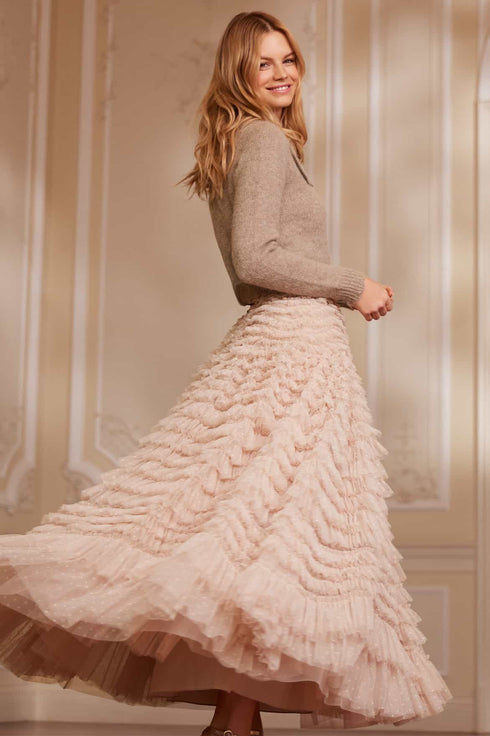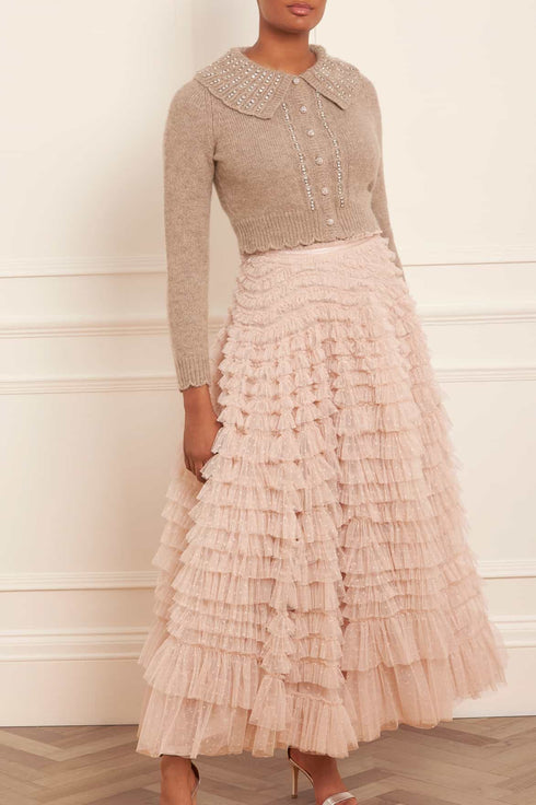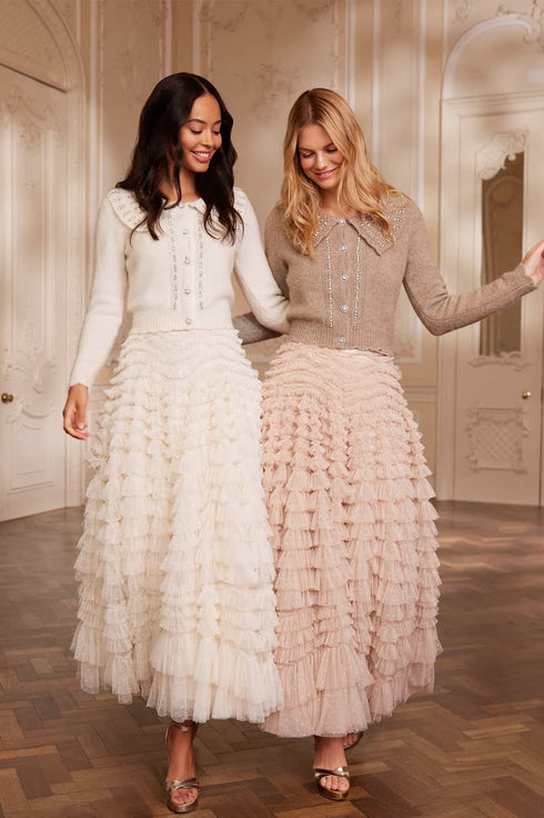 The Hattie Ruffle Skirt in Pebble. This textile skirt is engineered with layers of soft tulle and net to create a signature Needle & Thread style. Crafted with individual ruffles to create a beautiful, frilly texture. Designed with a sweeping hemline and finished at the waist with a satin ribbon for extra detail. We recommend pairing this skirt with our knitwear for a romantic Needle & Thread look.