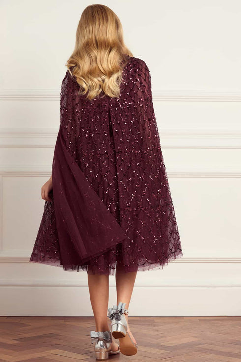 NEW SEASON. The Heart Lattice Cape Kids Dress in Claret. A romantic design, inspired by Victorian artistry in the Bright Star collection. Embroidered heart motifs are arranged in a lattice pattern across layers of soft tulle, while cape-style sleeves add a magical, fairy-tale detail. The rich claret shade is perfect for festive events. Pair with the Heart Lattice Ankle Gown in Claret from the womenswear range for picture-perfect matching.