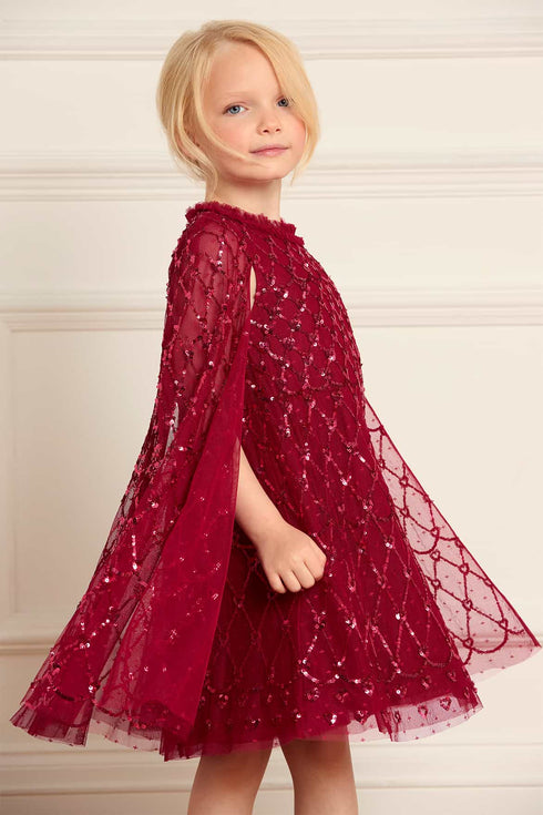 The Heart Lattice Cape KIDS Dress in Red. A brand new style for the season ahead. This KIDS cape dress is adorned with intricate embellishment, created using the smallest sequins for exquisite detailing. Featuring delicate heart-shaped motifs in a lattice layout. Beautifully developed with an integrated full-length cape for a statement look. A stunning dress for your little one's next event.