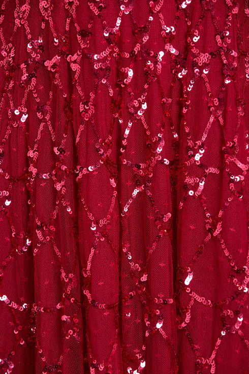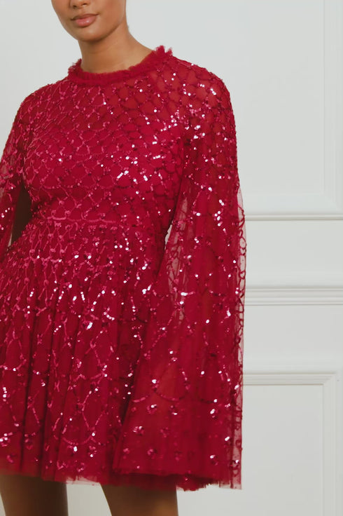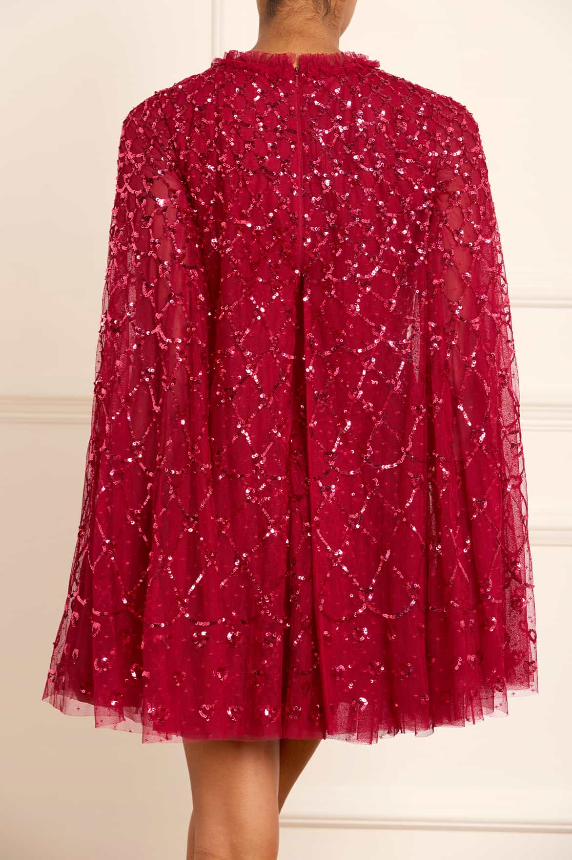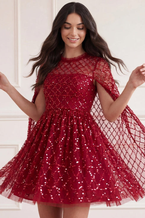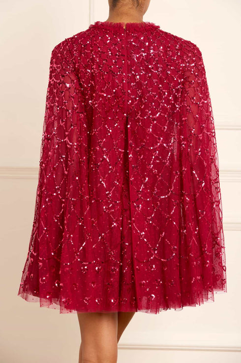 The Heart Lattice Micro Mini Dress in Red. This dress is decorated with intricate embellishments made using the smallest sequins for exquisite detailing. Beautifully designed with heart-shaped motifs in a lattice layout. This dress features a cape for romantic detailing and a statement look. Make an entrance at your next event.