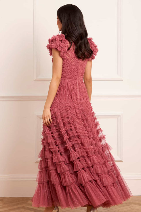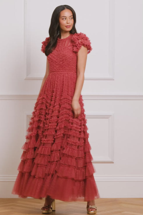 NEW SEASON. The La Vie En Rose Round Neck Short Sleeve Gown in Dark Rose. A romantic silhouette with contrast detailing. Layered ruffles trim the bodice and skirt, while soft gathers define the shape. The graphite tones enhance the femininity with a modern edge, making it a versatile choice.