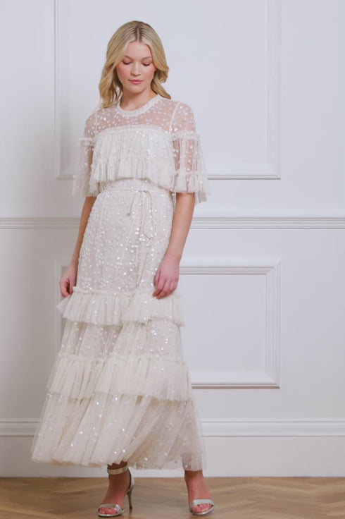 The Leila Dot Tiered Cape Ankle Gown in Cream features an integrated cape with gathered frills, adding a romantic touch. Crafted from signature Needle & Thread tulle, its loose-fitting silhouette offers an elegant, floaty look. Designed with a delicate fabric belt at the waist adds versatility. Beautifully embellished with shimmering clustered dot motifs and high-shine sequins, the gown is finished with signature tulle ruffles on the skirt and neckline. A truly captivating piece.
