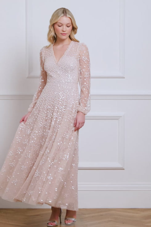 The Leila Dot V-Neck Ankle Gown in Pearl Pink is adorned with shimmering clustered dot motifs, creating a sparkling effect. This elegant V-neck gown features slim sleeves, with signature Needle & Thread tulle frills at the neckline and armholes. The skirt, crafted from layers of net and tulle, finishes with a sweeping hemline. A captivating design with dramatic flair.