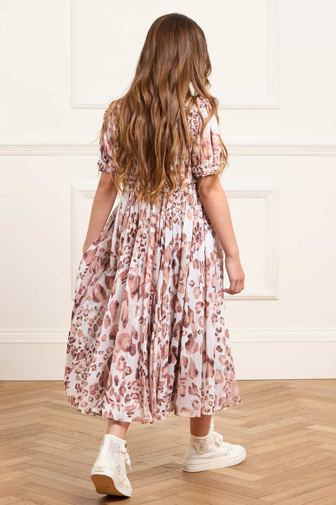 The Leopard Giselle Chiffon Kids Dress in Moonshine. Beautifully hand-painted in-house, this dress features a soft watercolor leopard print with varying motifs and delicate definition. Crafted from the softest chiffon, it has a shirred bodice adorned with signature Needle & Thread frills at the neckline, shoulders, and waist. The puff sleeves and ruffled cuffs add a charming touch. A fluid, delicately gathered skirt creates the perfect twirl-worthy silhouette.