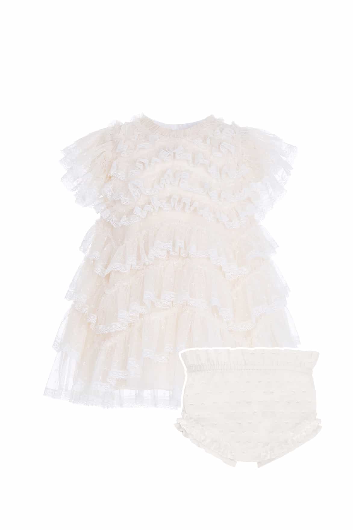 NEW SEASON. The Libby Lace Baby Dress in Cream. This pretty design features soft zig-zag tulle frills, delicate lace trims, and layers of signature tulle for a frothy, playful effect. Designed with whimsical frill sleeves and tulle accents on the neckline and shoulders add a charming touch. Lined in soft cotton voile for comfort, the set includes matching cotton dobby bloomers with frilled edges. Perfect for a special occasion, christening, or flower girl moment.