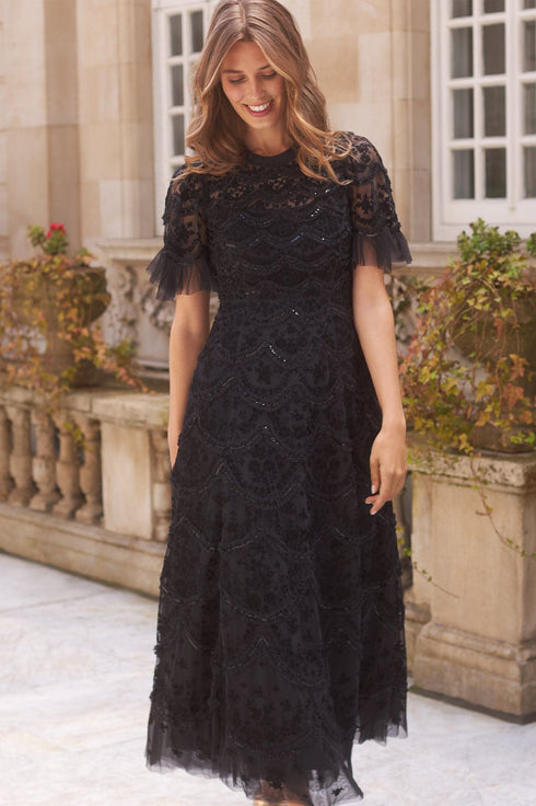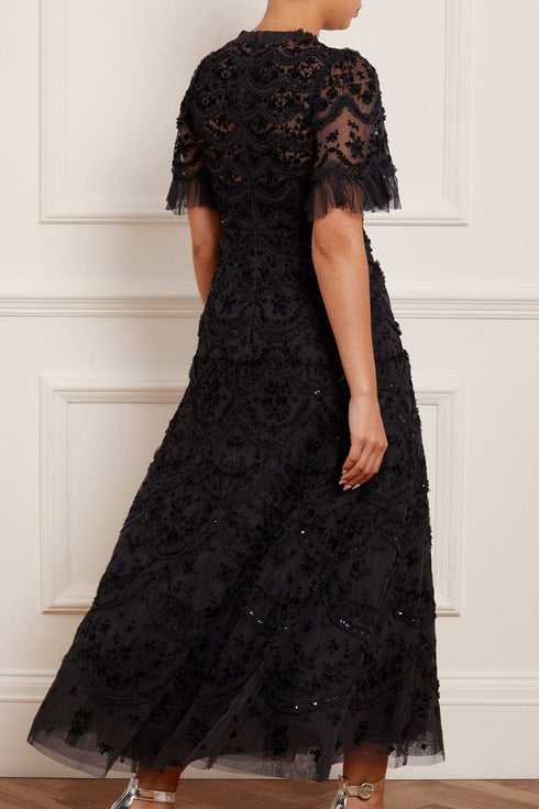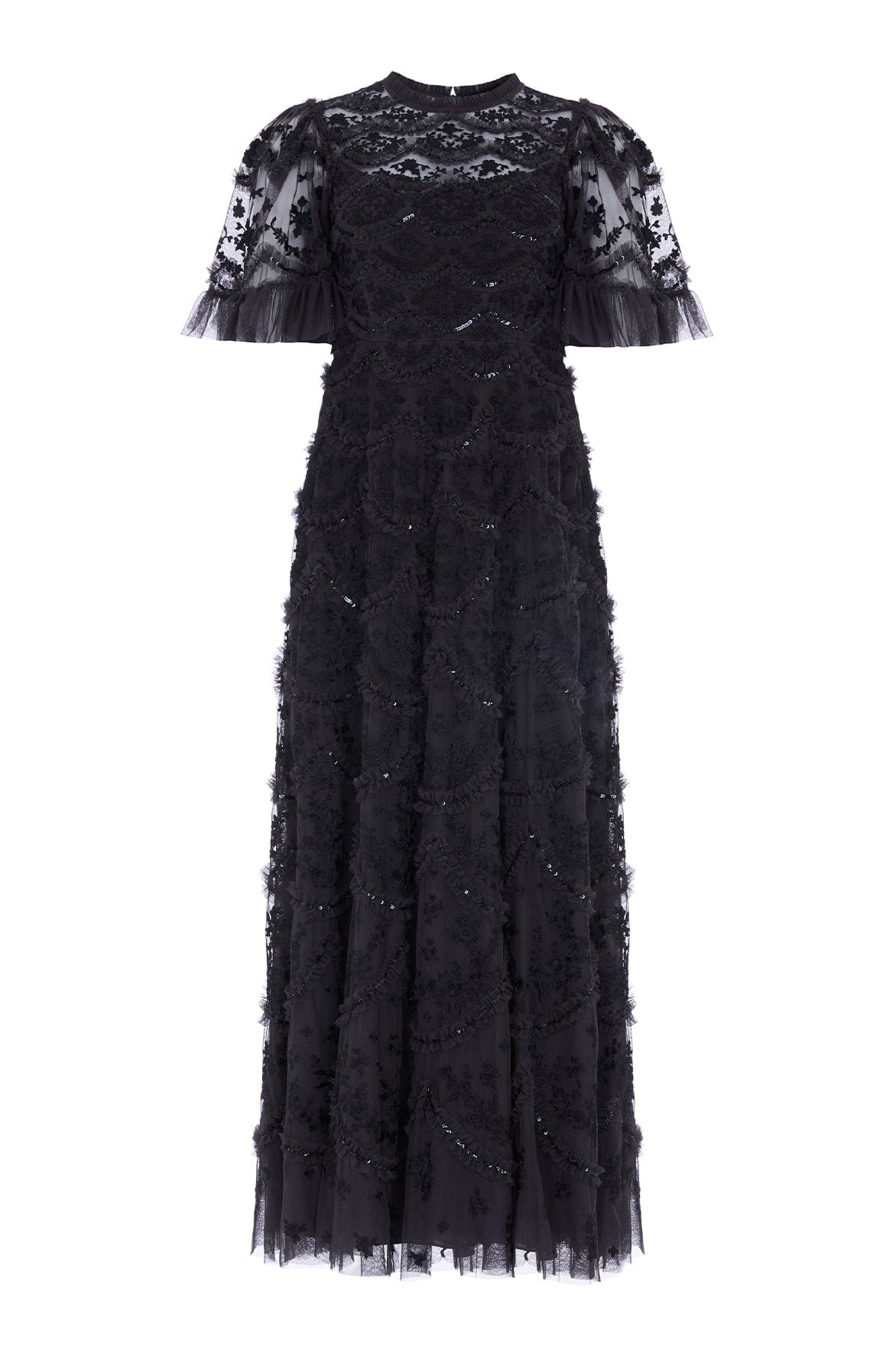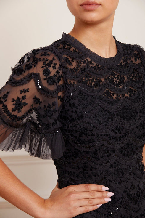 The Lily Bloom Ankle Gown in Graphite. This ankle gown is beautifully designed with delicate tulle ruffles and soft scallop shaping for signature Needle & Thread styling. Adorned with intricate white floral embroidery and trimmed with a high shine sequin adding shimmer throughout. Make the Lily your new wardrobe addition.