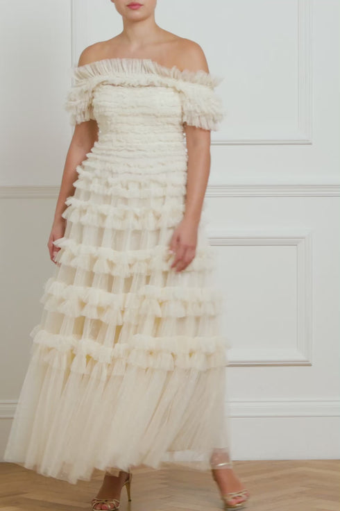 The Lisette Ruffle Off Shoulder Gown in Champagne. This statement gown has an elegant off-the-shoulder design inspired by Hollywood styling. Crafted with textile tulle and double-stitched frills for a dramatic, romantic effect. Features an integrated corset for a perfect fit and to hold the silhouette. Expect all eyes on you in this romantic gown.