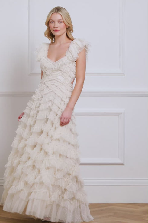 The Lola Backless Gown in Cream, a pretty new addition for the season. Designed with Needle & Thread’s signature elements, this gown is beautifully adorned with soft tulle and gathered frills, creating a frothy, textured effect. The backless design adds a touch of romance and playfulness, while the full-length silhouette exudes elegance. Perfect for a special occasion, this gown is sure to make a memorable statement.