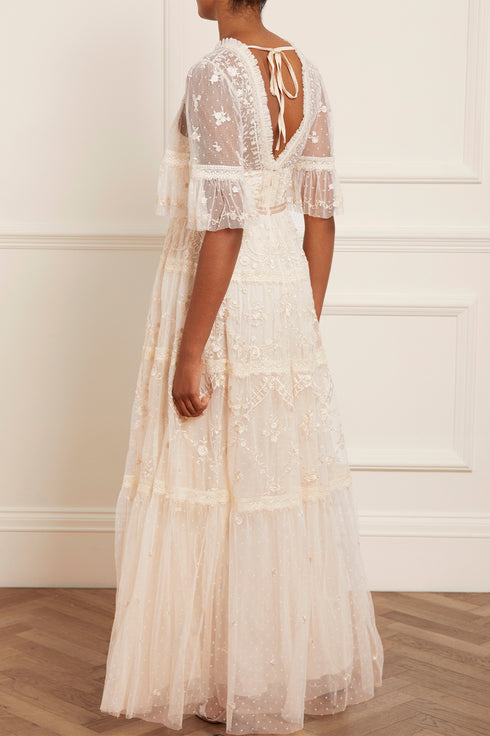 The Lottie Lace Gown in Champagne. A signature Needle & Thread style, updated for the new season ahead. Taking inspiration from Victorian lace, the Lottie features intricately embroidered artwork in a tonal thread featured on delicate tulle. Lace trims border the neckline and frame each tier of the skirt. This embroidered lace gown has sheer, romantic sleeves and our signature grosgrain ribbon at the waist. The perfect gown to take you from day to night.