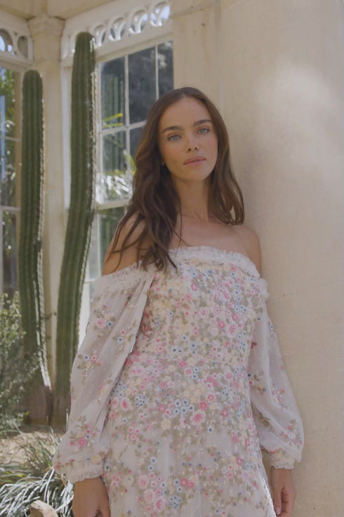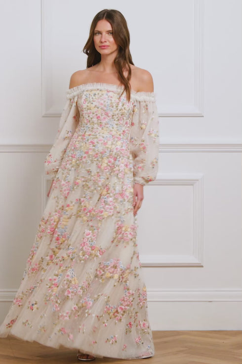 The Lunaria Wreath Off-Shoulder Long Sleeve Ankle Gown in Cream. This beautiful style is embroidered with delicate florals in a scattered garland artwork, inspired by an early 1900s design. Designed with pastel tones to create the perfect painterly artwork. Crafted with an off-the-shoulder neckline for elegant styling and developed with a layered tulle net skirt for a signature Needle & Thread look. Let the Lunaria romance you this season.