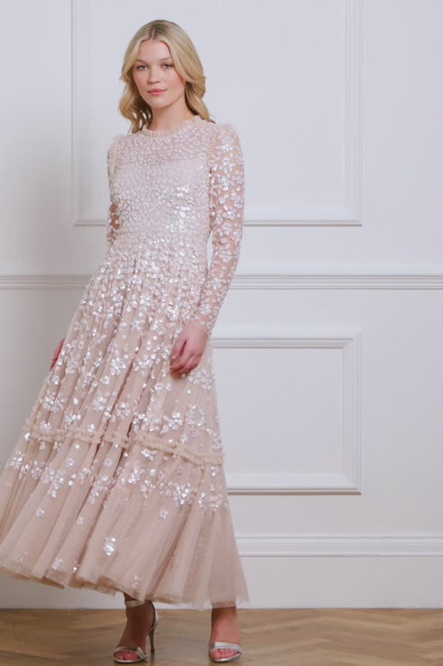 NEEDLE & THREAD EXCLUSIVE. The Maeva Ankle Gown in Pearl Pink is an exclusive Needle & Thread style, featuring floral sequin motifs on the bodice and sleeves, with trailing borders fading towards the hem. The high-shine sequins are enhanced with a foil coating, while tulle frills add signature detail. The voluminous skirt, made of layers of net and tulle, finishes with a sweeping hemline. A key piece in our collection.
