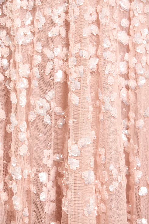 The Maeva Cami Ankle Gown in Pearl Pink reintroduces a signature Needle & Thread design, featuring floral sequin motifs on the bodice and trailing borders fading towards the hem. The high-shine sequins offer a lustrous finish. Developed with an elegant cami neckline, slim straps, and a softly gathered skirt tier with frothy ruffles, this gown exudes romantic charm. Layers of net and tulle create a voluminous skirt, finished with a sweeping hemline—a timeless piece to cherish.