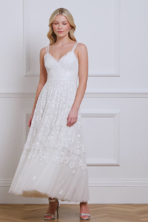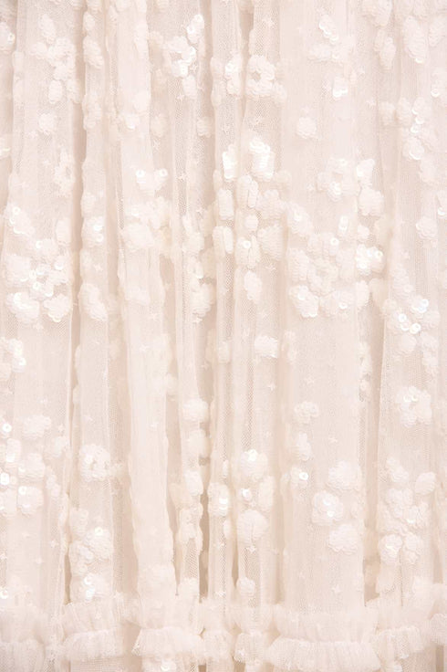 NEEDLE & THREAD EXCLUSIVE. The Maeva Cami Ankle Gown in Swan White reintroduces a signature Needle & Thread design, featuring floral sequin motifs on the bodice and trailing borders fading towards the hem. The high-shine sequins offer a lustrous finish. Developed with an elegant cami neckline, slim straps, and a softly gathered skirt tier with frothy ruffles, this gown exudes romantic charm. Layers of net and tulle create a voluminous skirt, finished with a sweeping hemline—a timeless piece to cherish.