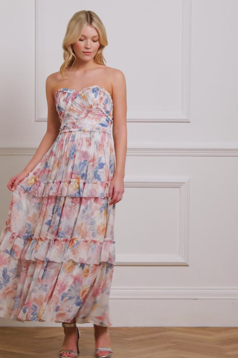 The Mariannes Floral Chiffon Strapless Ankle Gown in Moonshine draws inspiration from Victorian botanical artist Marianne North. Its vibrant floral print, with painterly brushstrokes, recalls a vintage archive design. The bodice features intricate ruched chiffon and signature Needle & Thread ruffles, while a stretch power-mesh internal corset ensures comfort and support. The loose-fitting skirt, with gently gathered tiers and topstitched frills, creates a romantic, flowing silhouette. Developed with soft, semi-sheer chiffon adds an ethereal touch, and the gown is fully lined for ease of wear.