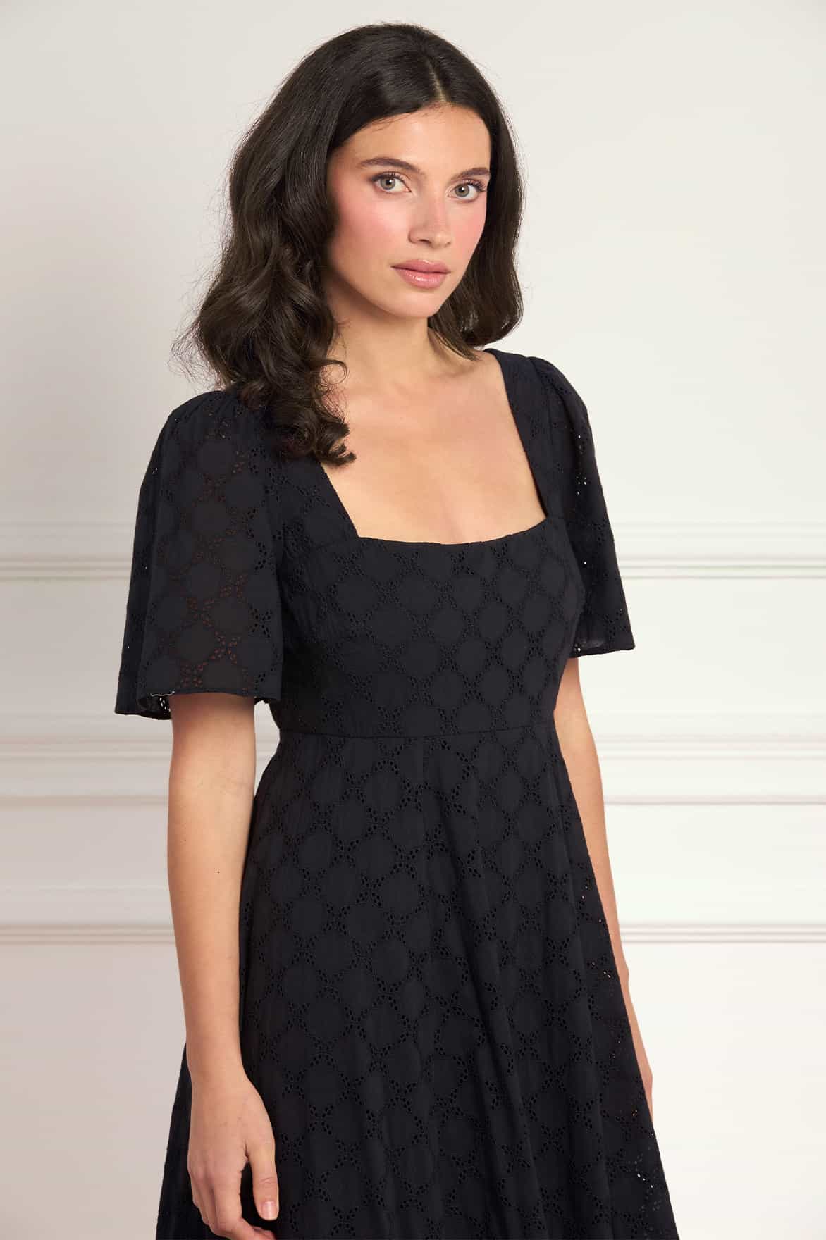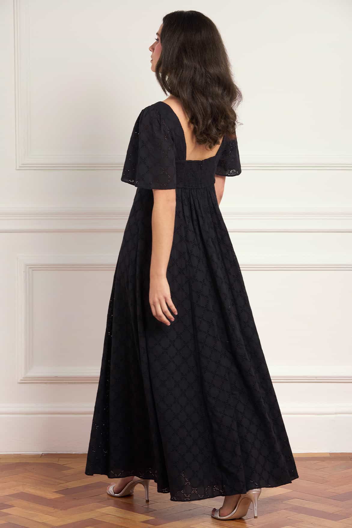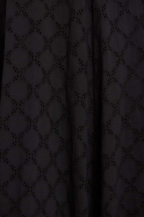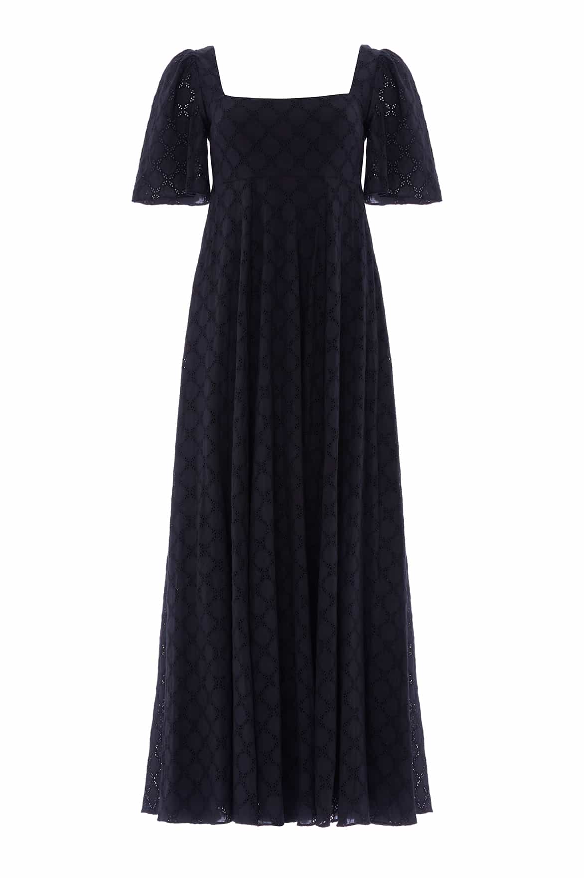 NEW SEASON | NEEDLE & THREAD EXCLUSIVE. The Marisol Cotton Broderie Short Sleeve Ankle Gown in Jet Black. An elegant ankle-length gown crafted from delicate cotton broderie in a diamond design. Featuring softly fluted short sleeves, a circle-cut skirt and a shirring panel at the back bodice for ease of wear and fit, the silhouette offers graceful movement.