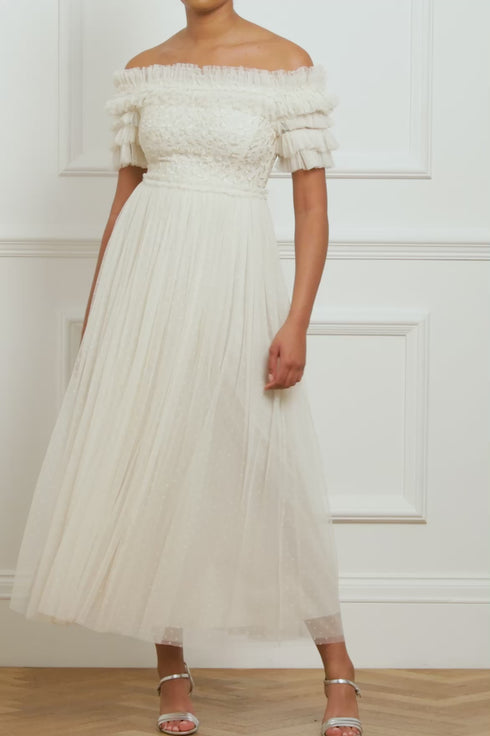 The Midsummer Lace Bodice Off Shoulder Ankle Gown in Cream. This gown is an update of our bestselling signature style. Beautifully developed with layers of soft, delicate tulle and an off-the-shoulder shape to create a romantic silhouette. The bodice is scattered with vintage-inspired embroidered motifs for a signature Needle & Thread look. The perfect style for a bridesmaid or special event.
