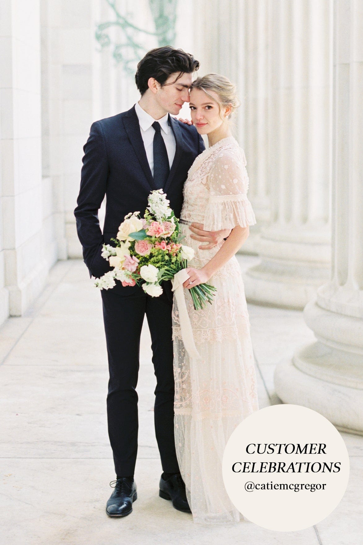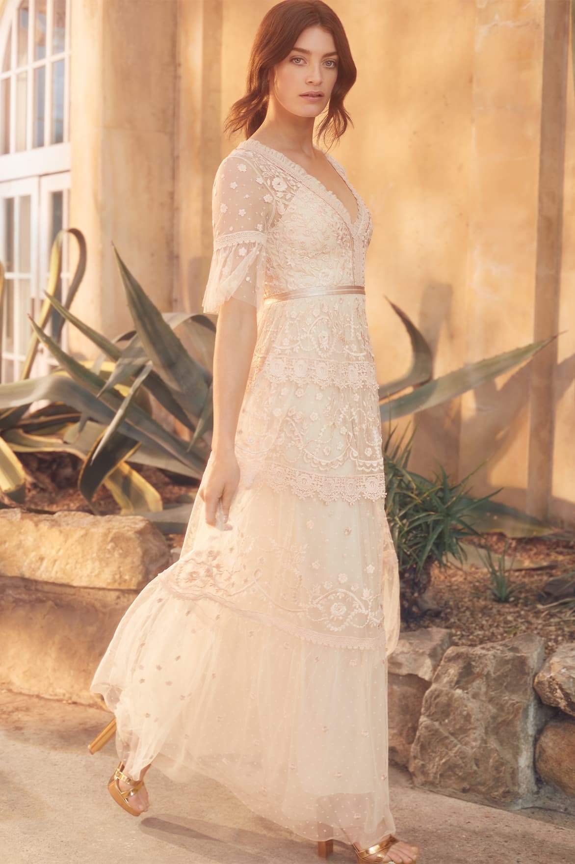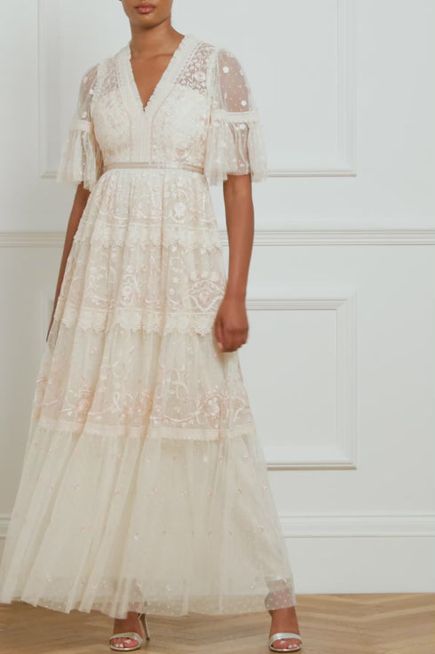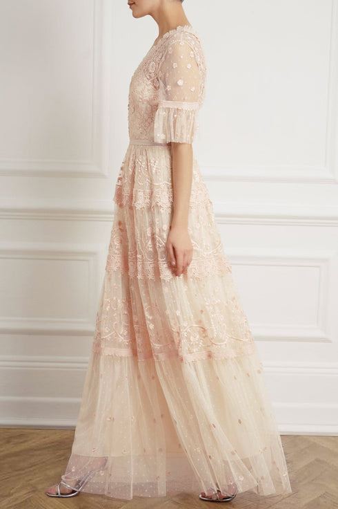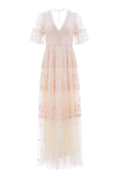 Midsummer Lace Gown in Champagne/Ballet Slipper. A signature Needle and Thread style, updated for the new season ahead. Taking inspiration from Victorian lace, the Midsummer features intricately embroidered artwork in romantic colours on delicate tulle. Lace trims border the neckline and frame each tier of the skirt. This embroidered lace gown has sheer, romantic sleeves and our signature grosgrain ribbon at the waist. The perfect gown to take you from day to night.