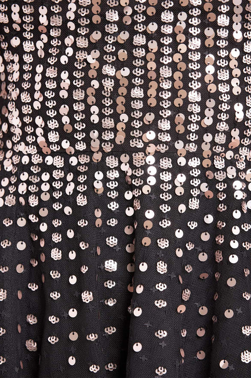 NEW SEASON. The Moonlight Sequin Cape Micro Mini Dress in Graphite/Metallic. Sparkle like a starry night sky with this showstopping party style. Cape-style sleeves drape elegantly from the shoulders, while the body is adorned with sequins that catch and scatter light like constellations. Playful and striking, this dress embodies the celestial mood of the Bright Star collection.
