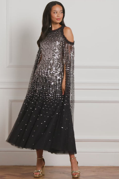 NEW SEASON. The Moonlight Sequin Cape Sleeve Ankle Gown in Graphite/Metallic. Inspired by the shimmer of moonlit skies, this gown features delicate sequins cascading from a fitted bodice into a fluid skirt. The dramatic cape sleeves create celestial movement, while the graphite base contrasts beautifully with metallic shimmer; a piece for unforgettable evenings.