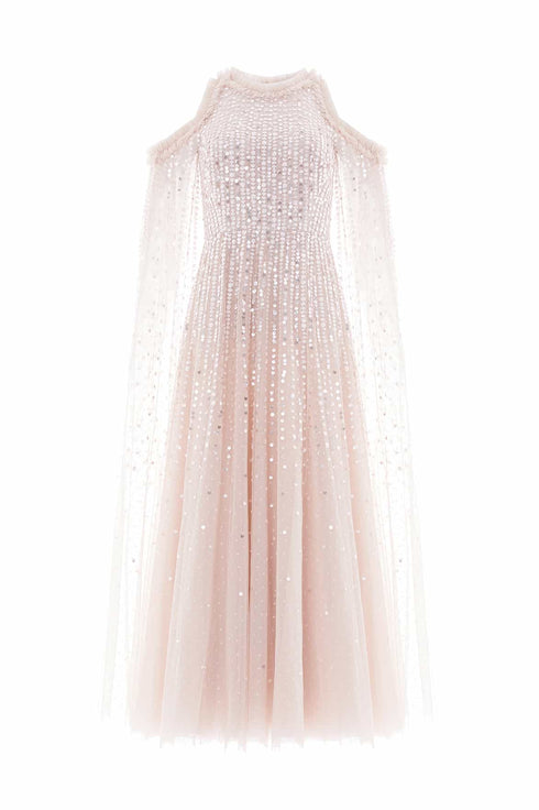 NEW SEASON. The Moonlight Sequin Cape Sleeve Ankle Gown in Oyster. Capturing the ethereal beauty of the Bright Star collection. Embellished with sequins that glisten like starlight, the gown features dramatic cape sleeves and a flowing tulle skirt. In soft oyster, it embodies timeless romance and celestial radiance.