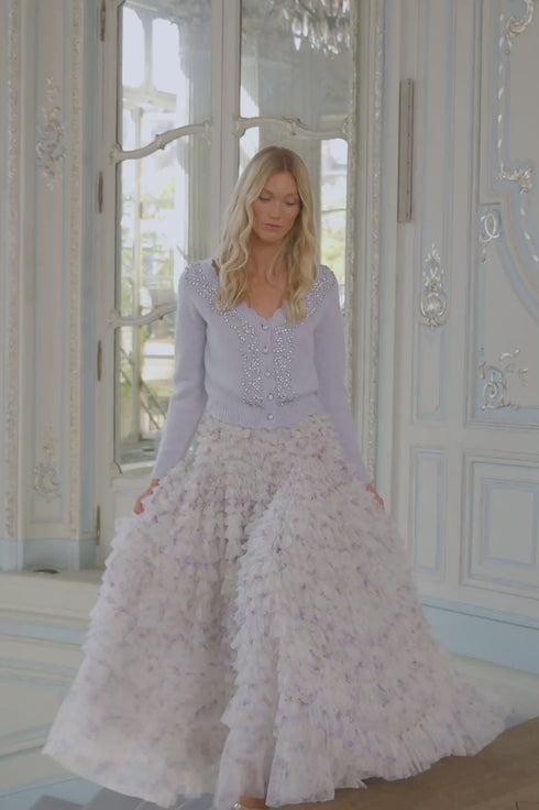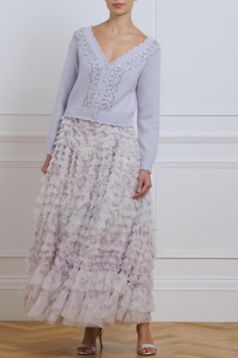 The Ophelia Ditsy Hattie Ruffle Ankle Skirt in Moonshine/Blue. This romantic trailing print is taken from an archive, hand-painted artwork from the early 1900s, depicting soft, whimsical ditsy floating florals. Crafted with individual ruffles to create a beautiful, frilly texture. Designed with a sweeping hemline and finished at the waist with a satin ribbon for extra detail. We recommend pairing this skirt with our Embellished V-Neck Short Cardigan for a romantic Needle & Thread look.