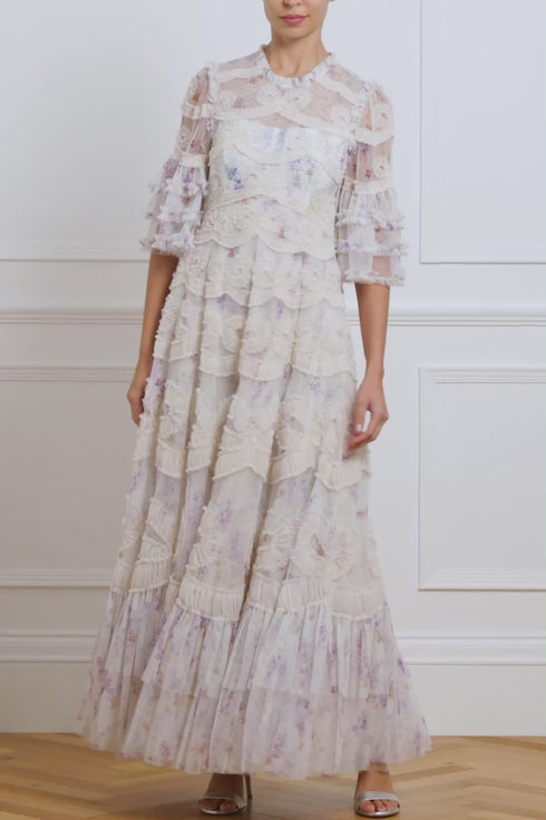 The Ophelia Ditsy Ingrid Gown in Moonshine/Blue. This beautiful, romantic trailing print was taken from an archive, and hand-painted artwork from the early 1900’s depicting soft whimsical ditsy, floating florals. This iconic Needle & Thread style is beautifully engineered with delicate tulle and subtle texture to capture this ribbon motif. A gown you'll forever treasure.
