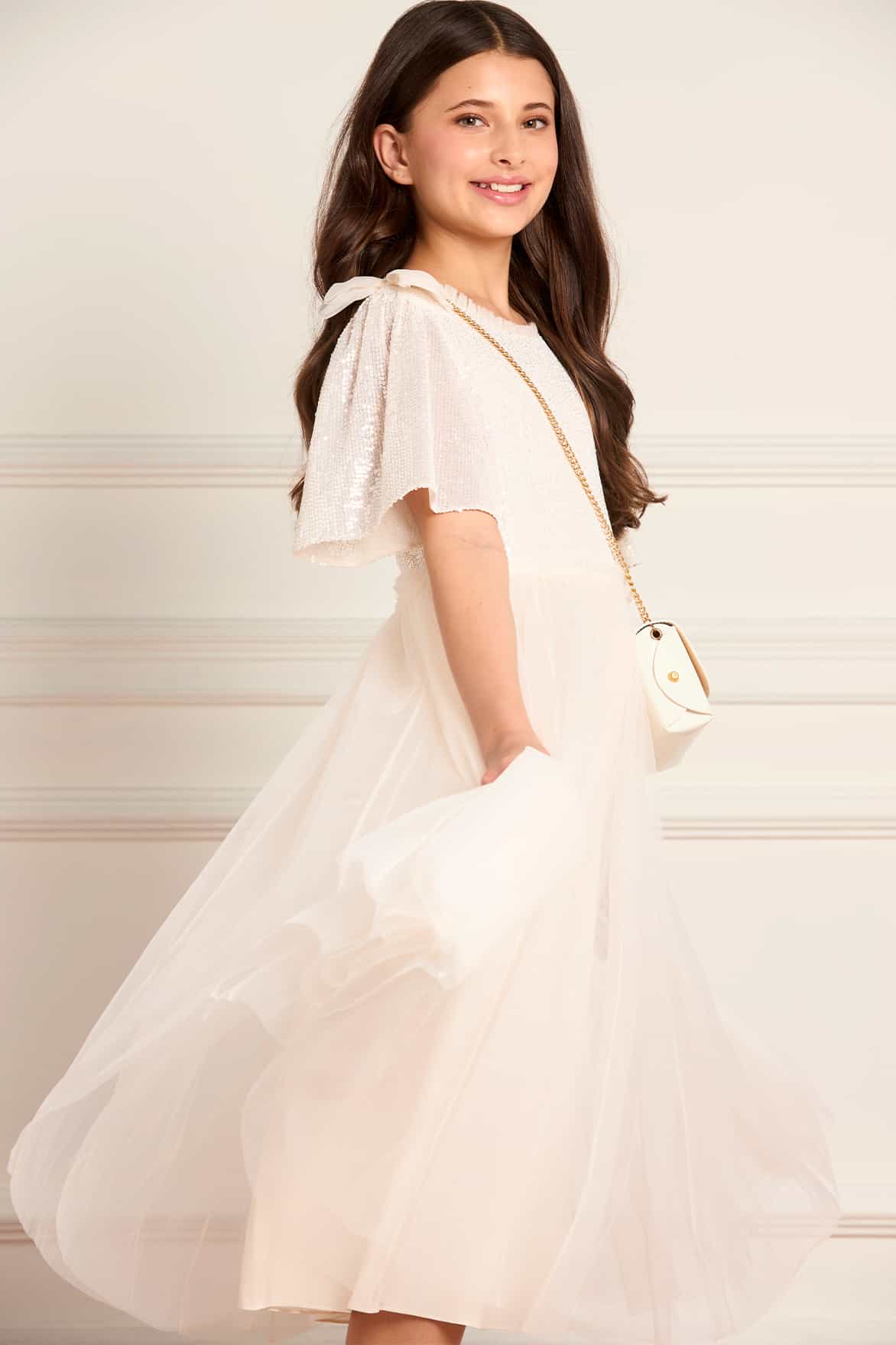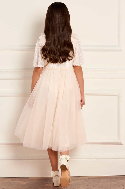 NEW SEASON. The Paloma Bow Kids Dress in Cream. A sweet tulle design featuring a statement bow detail. With a softly gathered skirt and delicate trims, it’s a timeless style for special family moments.