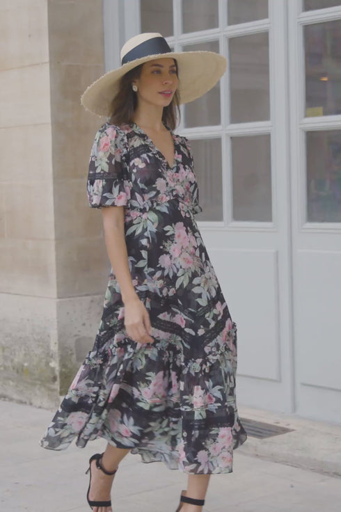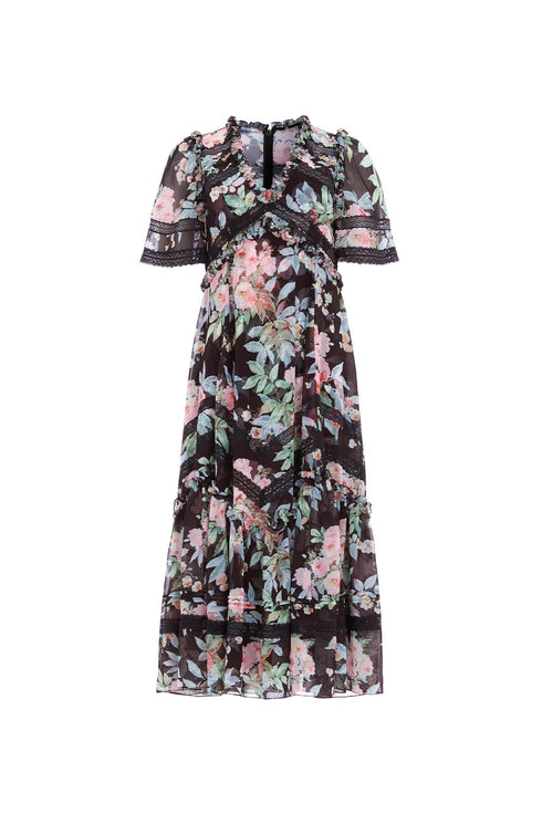 The Paradise Garden Sonata Georgette Ballerina Dress in Graphite. The print of this dress is inspired by an enchanting paradise garden print, taken from an 1900s hand-painted artwork. This dress is designed with a luxe, twilight inspired colour palette in rich, lush floral motifs to create a truly alluring print. Developed in our soft, georgette fabric creating a flowing silhouette. Designed with Victorian inspired garments featuring a lace insert detailing and panelling. A transitional day to night piece.